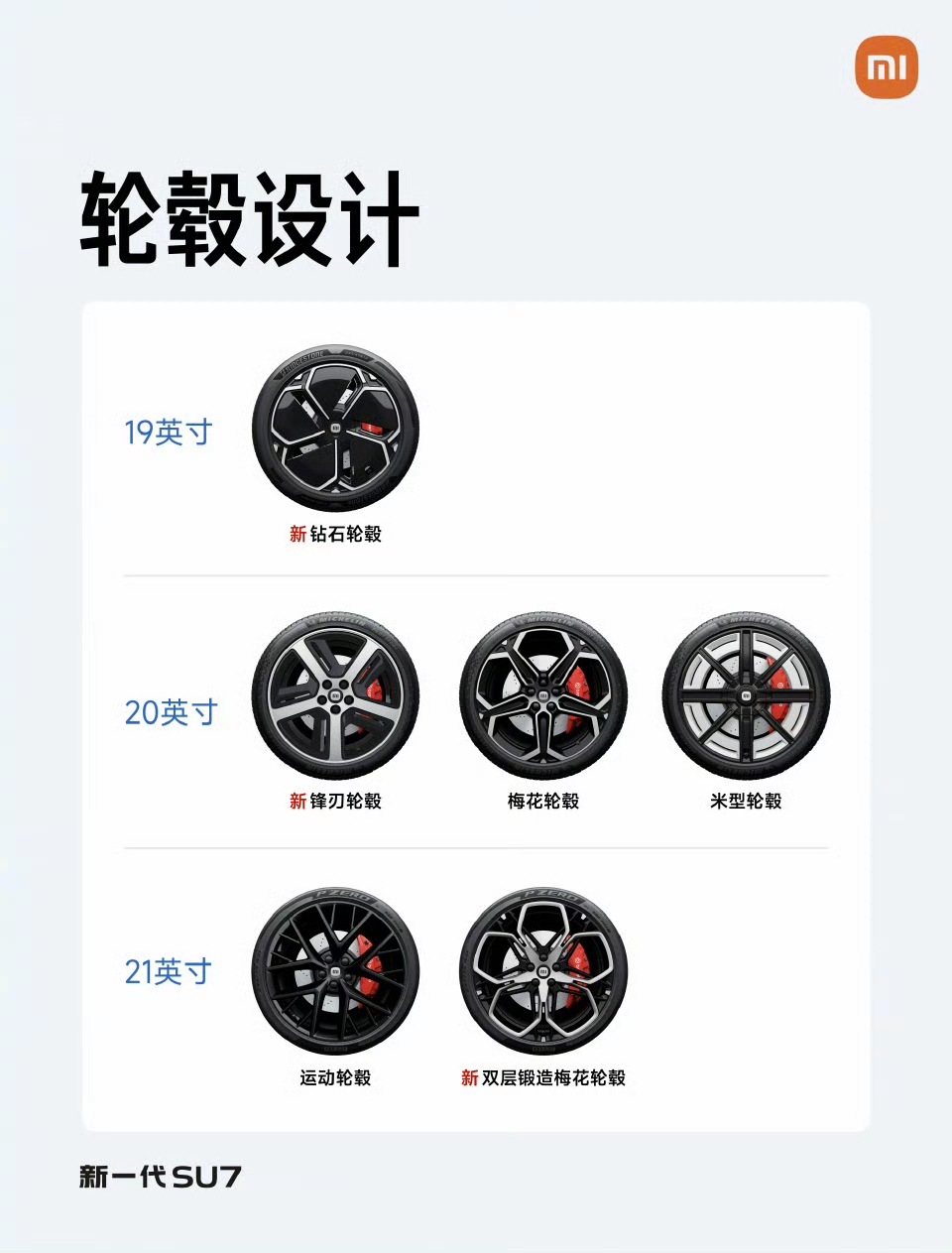 新一代小米 SU7 的颜色和轮毂公布了轮毂一共有六款,涵盖了 19-21 英寸。颜色方面保留了四款基础色,还新增了三个专属新配色,同时加入了 SU7 Ultra 的曜石黑和 YU7 的流金粉。大家喜欢哪个颜色