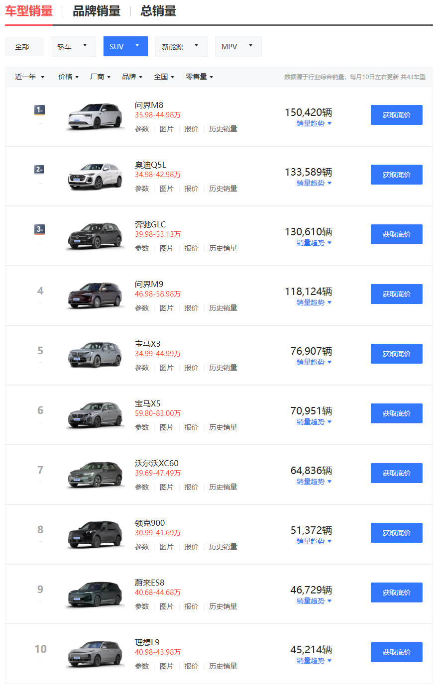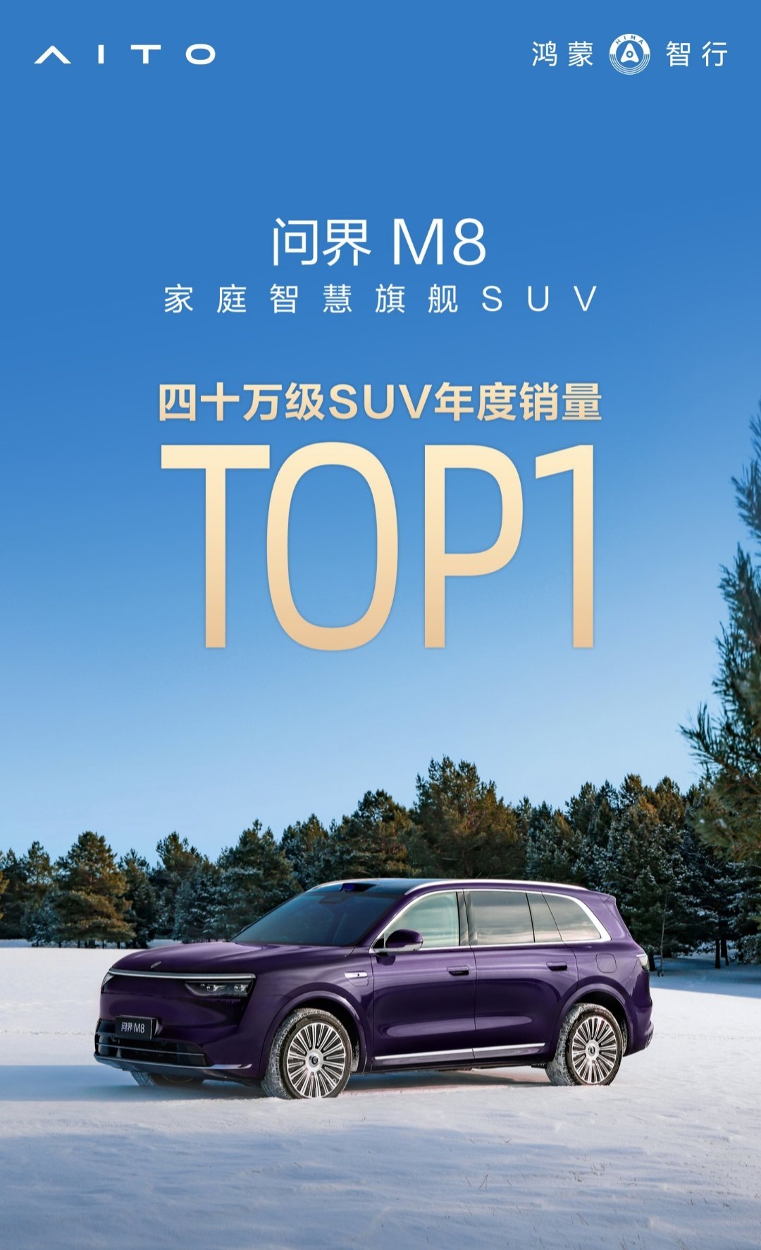 【鸿蒙智行:问界 M8 汽车获 2025 年度四十万级 SUV 销量第一名】鸿蒙智行宣布,问界 M8 汽车获 2025 年度四十万级 SUV 销量第一名。官方介绍称,目前问界 M8 新增限时 8000 元选配金,预计 2-4 周内可提车。官方暂未公布问界 M8 的销量数据,但官方海报小字注释显示数据来源于易车网。IT之家查询获悉,问界 M8 近一年销量达 150,420 辆,在销量榜位居第一。该榜前十包括:问界 M8、奥迪 Q5L、奔驰 GLC、问界 M9、宝马 X3、宝马 X5、沃尔沃 XC60、领克 900、蔚来 ES8、理想 L9。去年 4 月 16 日,问界 M8 增程版正式上市,提供增程 Max、增程 Max+、增程 Ultra 三种不同配置,售价 35.98 万-44.98 万元起;同年 8 月 25 日,问界 M8 纯电版上市,搭载华为高压七合一电驱,标配宁德时代 100kWh 电池,售价 35.98 万-44.98 万元起。鸿蒙智行问界 M8 定位“家庭智慧旗舰 SUV”,该车首批搭载 HUAWEI ADS 4,支持主动安全、智能驾驶辅助、智能泊车辅助,上市 8 个月交付破 15 万台,号称“四十万级销冠”,建议零售价 35.98 万元起。