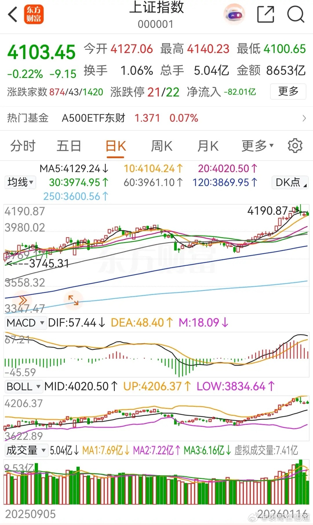 又是高开低走!今天上午大盘因利好高开后走高,随之冲高回落后走低,最低打到了4100点,之后横盘整理,临近午盘时震荡加剧。昨日盘后对今天的走势做过简单推测,预计将会收出一根带上下影线的小阳线,上午大盘先是小幅冲高,随后回踩一次,现在看基本符合预期;对于大盘下午的走势,还是坚持昨日盘后看法,今天下午大盘将开始震荡拉升,尾盘时再次勾起。今天上午券商概念板块再次充当了砸盘的先锋工具,高开后直接快速杀跌,砸绿后在低位震荡整理,但是重心一直都在下移,下午大盘要是起来,这家伙不能再继续砸盘了。午间收盘时,全市场上涨个股2049家 ,下跌3313家 ,其中47只股涨停;市场半日合计成交金额为1.9896万亿元,相比昨日同期放量1171亿元。从盘面上看,目前大盘的调整时间已经是第四天了,商业航天今天的走势也出现了分化。所以,这里大的下杀,基本上不会再出现了!