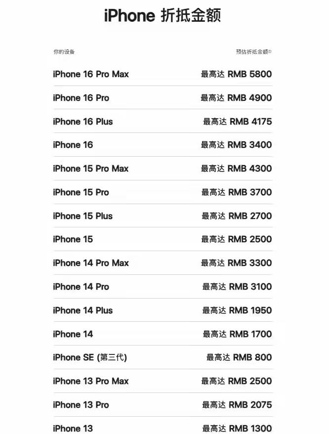 苹果以旧换新抵扣价更新 根据最新的苹果以旧换新政策更新,用户在进行旧机换新时,iPhone 16 Pro Max的最高抵扣额度已提升至5800元。这意味着用户可以通过以旧换新活动,最大程度地降低购买新款iPhone 16 Pro Max的实际支付金额。 此外,值得注意的是,华为、小米等其他安卓品牌的机型也已被纳入此次折抵范围。这为消费者提供了更广泛的选择空间和更高的折扣潜力。 主要亮点包括: iPhone 16 Pro Max最高抵扣5800元,显著降低换新成本。 多品牌支持:华为、小米等安卓机型也可参与折抵,提供更多选择。 政策优化:换新流程更便捷,折抵额度更高,激励消费者升级换代。 如果你计划换新,建议提前了解具体的换新流程和可抵扣的旧机型号,以便最大化享受优惠苹果旧手机回收 苹果17退差价 苹果回收价 。