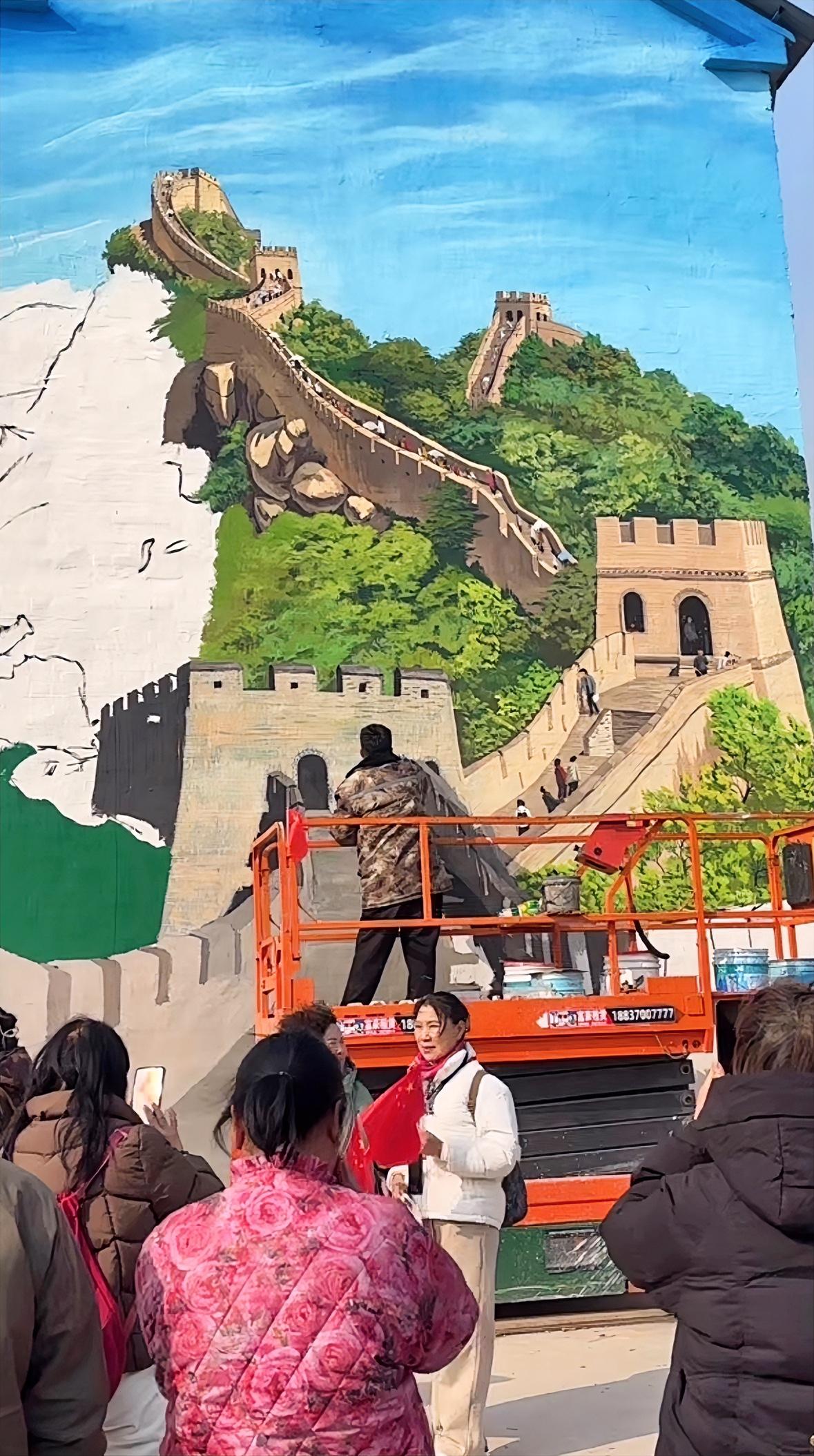 吴营村墙绘长城即将完工,这是吴老师在吴营村的第50幅画作。 吴老师画长城已持续一周,借助升降机绘画目前长城主体已画好正在上色,吴营村将再添一处打卡景地。 眼看吴营村的墙快被吴老师画完,不过随着热度的持续不少地方在模仿吴老师画墙绘,吴老师笔下的吴营村氛围无法模仿。吴营村长城墙绘
