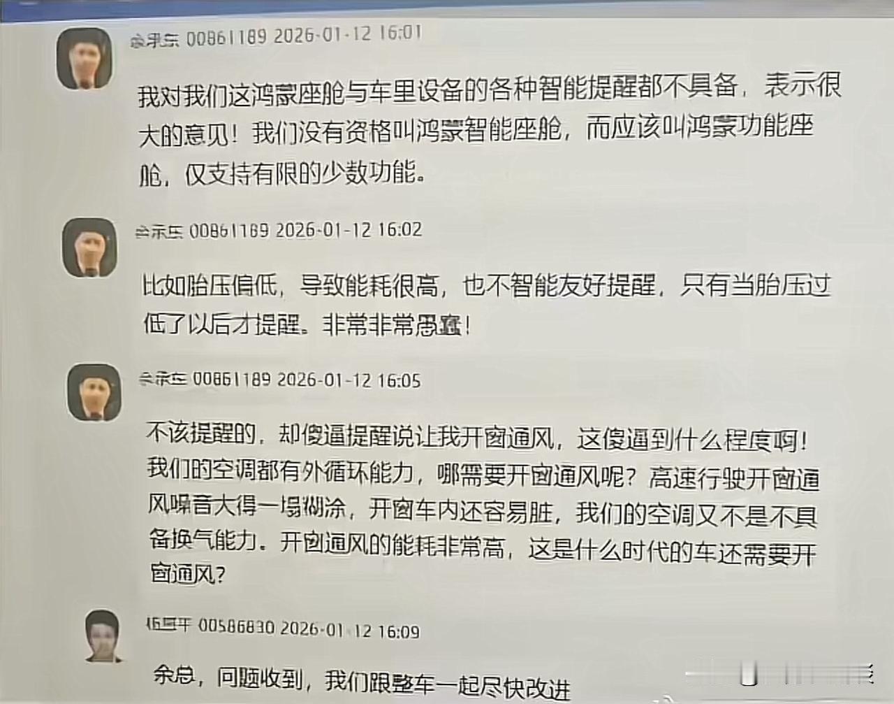 余承东怒批没有资格叫“鸿蒙智能座舱” 胎压监测很愚蠢…… 1,坦言应该叫功能座舱,只支持少量的功能。 2,另外还说胎压检测不够人性化,胎压偏低的时候很耗电,但是车辆不进行提醒,只有到了缺气严重时候才会提醒,很愚蠢。 3.另外一直提醒开窗通风,车辆本来就有自动换气功能,假如在高速上面开窗通风噪音大的很,而且车辆也会很脏,这个时代的车辆还需要开窗通风.? 看到出来他对这款是真心的入手体验而且说出了车辆的一些缺陷,也给出了改进的建议。 对于想要买这辆车的人来说,这是一件好事。车辆的使用只有不断的改进,才是最适合消费者的。比那些不听取意见盲目造车的要好很多……