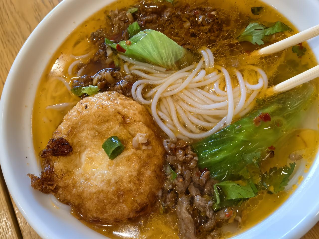 落地西双版纳的第一餐,杂酱米线,香迷糊了。 以前在异地工作时,有位同事妹妹是云南人,对米线情有独钟,每天午餐都会带着我去解锁那个城市的各种米线,于是我也就爱上了吃米线。 我到宁波工作后,我们就慢慢失去了联系,但不知为何,每次我吃米线时都会想起她,想起我们在一起嗦米线的快乐。 今天一早从宁波飞了四小时到达西双版纳嘎洒机场,从机场到高铁站,本来走路一公里左右,我们打车花了半个多小时才到。 在站前广场吃了一碗杂酱米线,(⊙o⊙)哇,太正宗了,米线软糯可口,入口即化,汤汁鲜辣美味,看来要吃美味的米线还是要来云南。