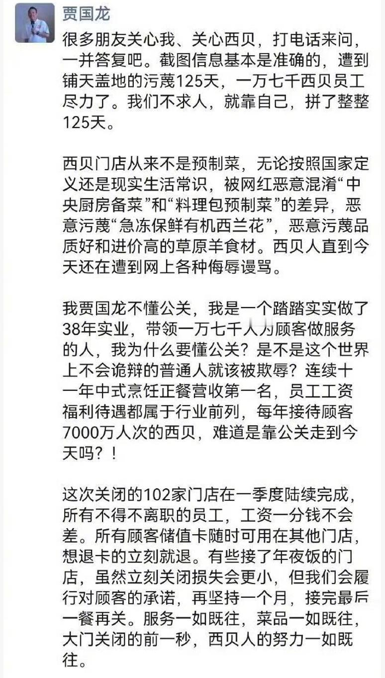 针对网络流传的“一次性关闭102家门店”说法,西贝餐饮创始人贾国龙于1月15日在微信朋友圈确认了关店计划,并表示离职员工工资将足额结清,顾客持有的储值卡可继续在其他门店使用或办理退卡。已承接年夜饭预订的门店将“再坚持一个月,完成订单后再关闭”。贾国龙称,未来将继续努力争取生存,并强调其个人资产仅有北京一处房产,在呼和浩特则为租房居住,且无海外资产。他表示将始终与西贝和顾客站在一起。(澎湃新闻)