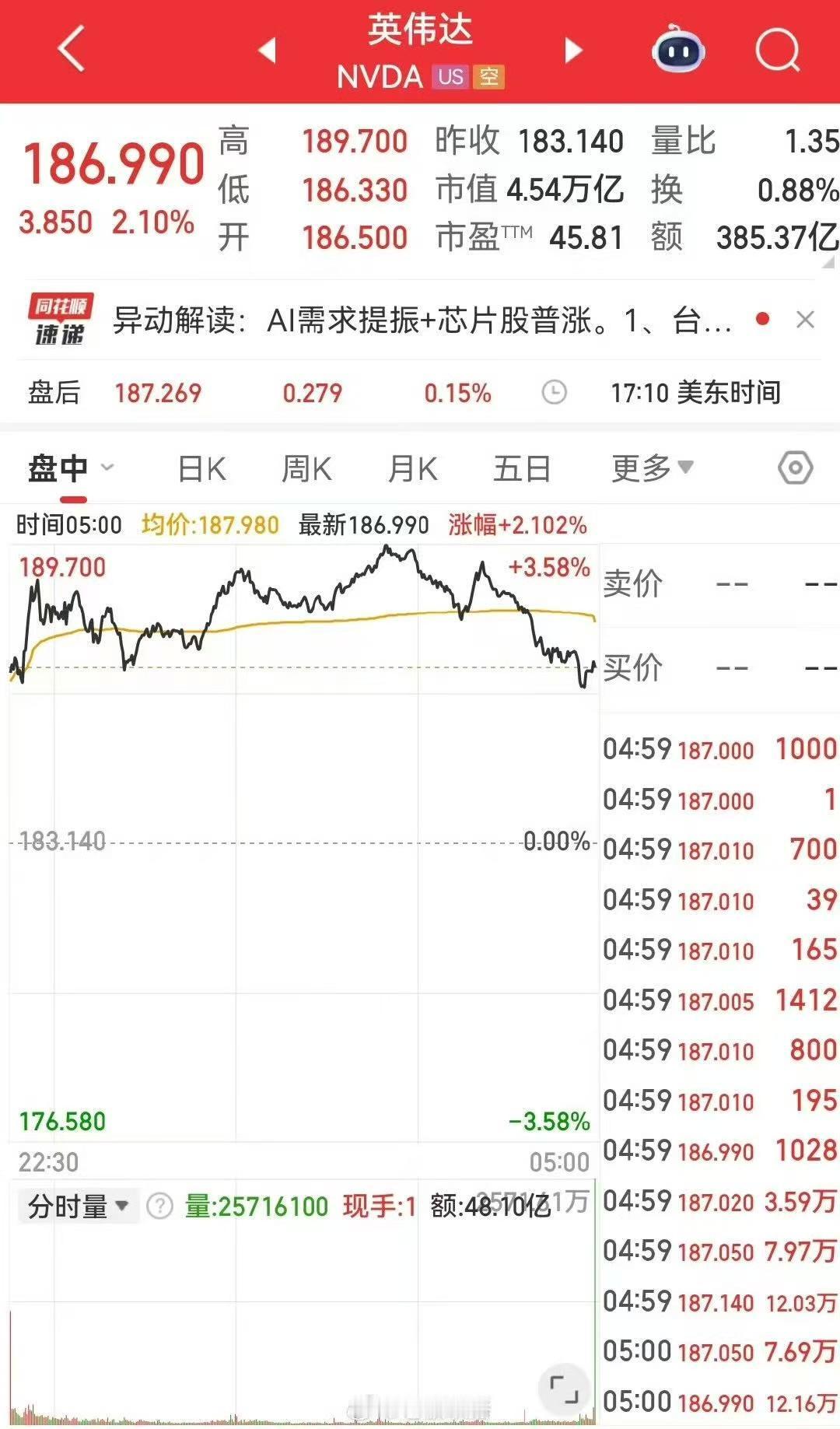 1月15日美国股市收盘,三大主要股指均上涨,道琼斯指数上涨0.60%,标普500指数上涨0.26%,纳斯达克指数上涨0.25%。英伟达股价报收于186.99美元,盘中涨幅一度超过3%,最终收涨2.10%,公司市值达到4.54万亿美元,单日市值增长约950亿美元(约合人民币6618亿元)。(每经)