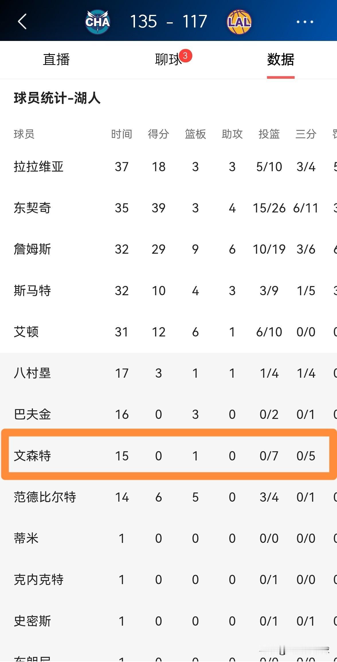 我强烈建议湖人主帅雷迪克弃用文森特!在今天湖人主场以117:135惨败于黄蜂的比赛中,文森特在进攻端的表现简直糟糕透顶,他在替补出战的15分钟里,投篮7中0,其中三分球5中0怒砍0分,还有4次犯规,他的场上正负值为-15。 我强烈建议湖人主帅雷迪克在接下来的比赛中弃用文森特,以文森特目前的状态来看,他不应该进入到球队的轮换阵容里。