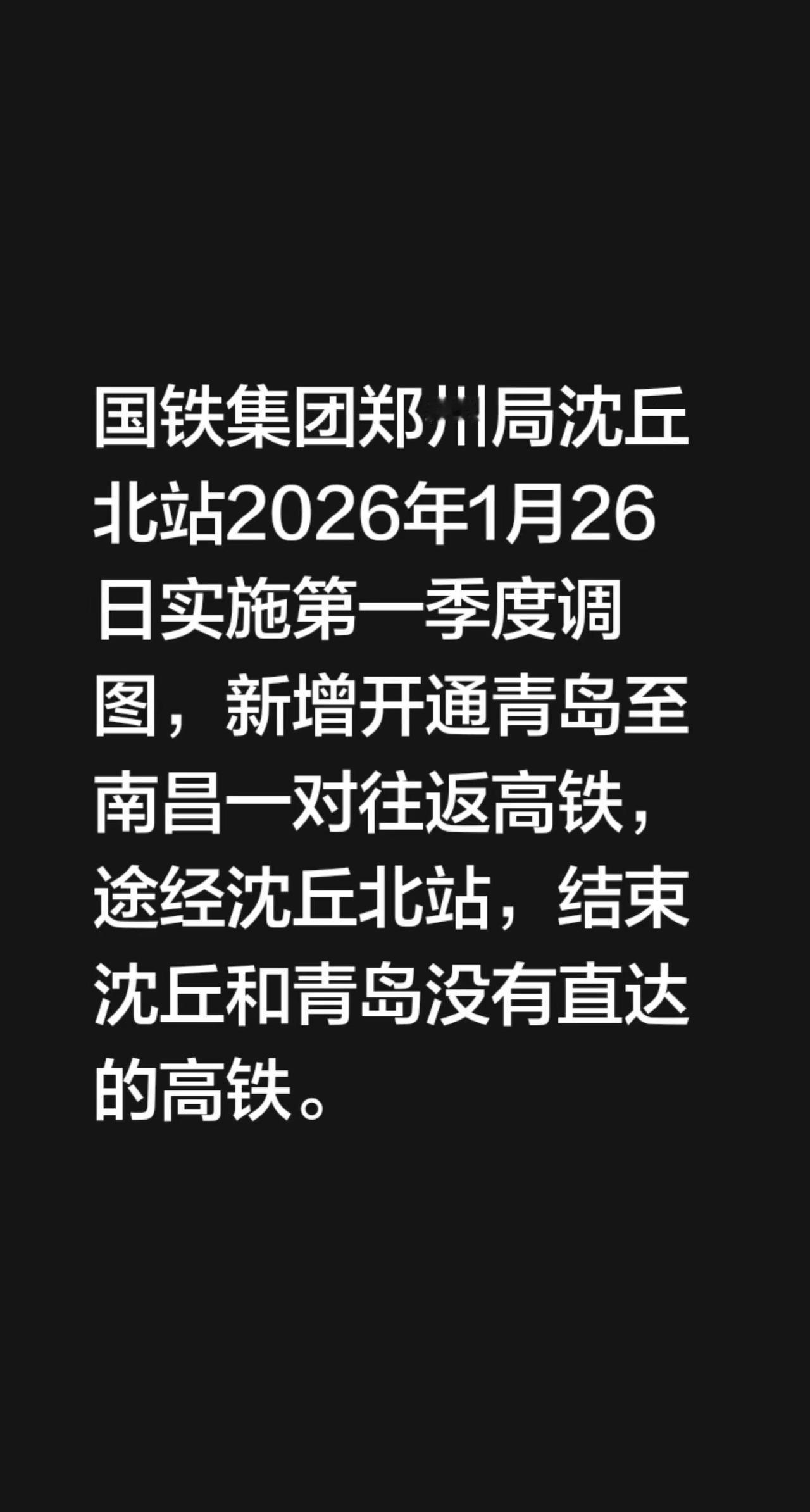 国铁集团郑州局沈丘北站2026年1月26日实施第一季度调图,新增开通青岛至南昌一对往返高铁,途经沈丘北站,结束沈丘和青岛没有直达的高铁。