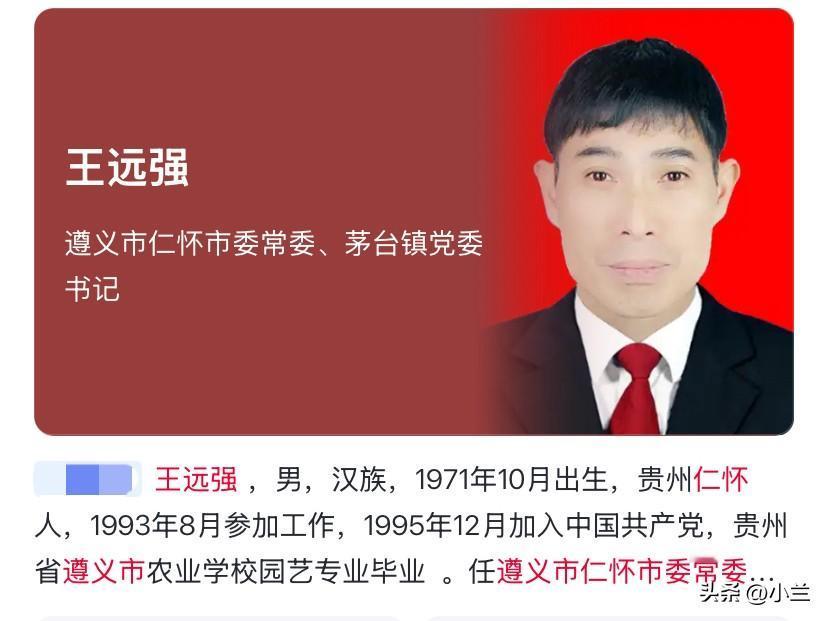贵州省遵义市茅台镇的王远强在55岁这年上了热搜!他是贵州省仁怀市人,他30多年来一直在贵州仁怀工作。 1992年他从贵州省遵义农业学校园艺专业毕业了,等了一年,在1993年8月份被分到贵州省仁怀县九仓镇工作,从一名农技职员做起。 在贵州省仁怀县九仓镇他待了15年,直到2008年他来到仁怀市学孔乡当上二把手,此后他在多个地方担任一把手。 2020年他调任到茅台镇工作,坐上了一把手位置,同时还是茅台古镇文化产业园区的总经理,可就在新岗位上5年多后,该来的还是来了,现在东窗事发,该要为自己的行为买单了,实在是令人惋惜!