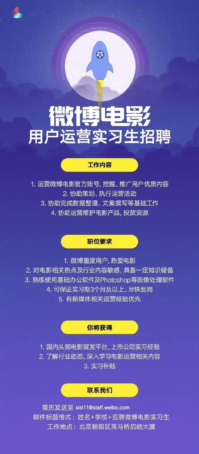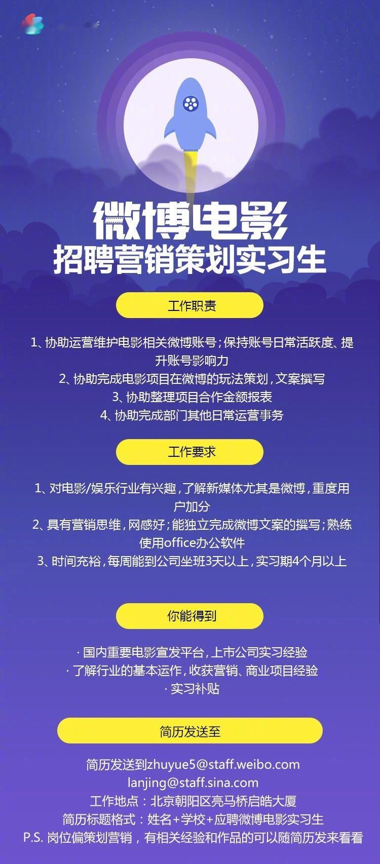 招聘 微博电影最新招聘【用户运营实习生】1名、【营销策划实习生】1名!工作地点:北京朝阳亮马桥,实习期3个月。感兴趣的小伙伴请戳下图了解详情并投递简历 新浪&微博招聘