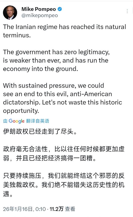 过气政客还刷存在感?瘦到脱相的美国前国务卿蓬佩奥称伊朗政权已经走到了“必然的终结阶段”:“让我们不要浪费这个历史性机遇。” 当地时间1月15日,蓬佩奥在X平台发文大放厥词,宣称伊朗政权已走到自然终点,骂其没合法性、处境虚弱,还把伊朗经济困境全归罪于政权,呼吁持续施压抓住所谓机遇。 这番言论很快被国际媒体广泛援引,看似有影响力实则尴尬,毕竟他早已不是美国核心决策层人物,如今的叫嚣更像没人捧场的独角戏,也就只能靠骂伊朗博点版面。 这可不是他第一次拿伊朗说事,任内就把反伊当核心任务,2018年不顾国际反对,推动美国退出伊核协议,随后对伊朗实施极限施压,搞全方位经济制裁,手段狠辣至极。 他口中的持续施压,早被证明是双刃剑,制裁确实让伊朗经济受创,民生承压,但没打垮伊朗政权,反而激化当地反美民意,让伊朗更坚定对抗美国的立场,得不偿失。 更讽刺的是,现任特朗普政府态度和他完全相悖,白宫明确释放外交优先信号,军事打击仅作为备选方案,压根不愿陷中东持久战,摆明了不想接他留下的烂摊子。 蓬佩奥不可能不清楚政府立场,却故意唱反调,他深知反伊是美国保守派的热门话题,靠这种极端言论能拉拢票仓,为2028年大选铺路,算盘打得精到骨子里。 他任内搞的经济胁迫手段,早已遭国际社会诟病,不仅针对伊朗,还胁迫其他国家跟风制裁,破坏全球供应链,被指责为了霸权不惜割裂世界经济,留下一堆后遗症。 伊朗方面虽没直接回应,但用实际行动打脸,近年来不断强化自身国防实力,还拓展对外合作缓解制裁压力,根本没像蓬佩奥说的那样走向虚弱,反而越抗越稳。 欧洲盟友对他的言论也颇为抵触,多数欧洲国家希望通过对话解决伊核问题,不愿再被绑在美国的强硬战车上,没人愿意配合他的极端主张,孤立的只有他自己。 有人调侃他是“瘦脱相还闲不住”,这话一点不假,没了权力光环就靠挑事博眼球,把国际争端当成自己的政治跳板,这种政客的算计实在让人不齿。 蓬佩奥的叫嚣也暴露一个现实,美国内部对伊政策分歧仍在,保守派想加码施压,务实派想稳妥收场,这种内部分裂只会让美国在中东的处境更被动。 国家间的分歧从不是靠嘴炮解决的,蓬佩奥任内的强硬政策已经证明,施压只会加剧对立,唯有平等对话才能找到出路,这是他始终不愿承认的事实。 靠极端言论博存在感终究是昙花一现,国际社会需要的是务实解决问题的态度,而非过气政客的煽风点火,理性沟通才是化解分歧的唯一正道。 大家觉得蓬佩奥能靠反伊话题成功复出吗?美国对伊政策还会再转向吗?欢迎各位在评论区留言!