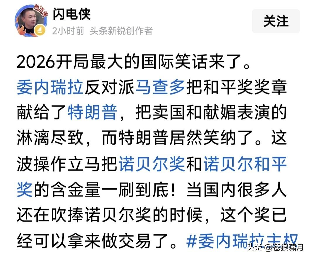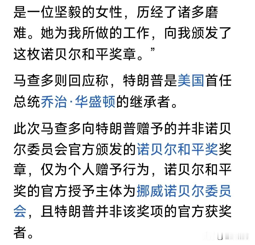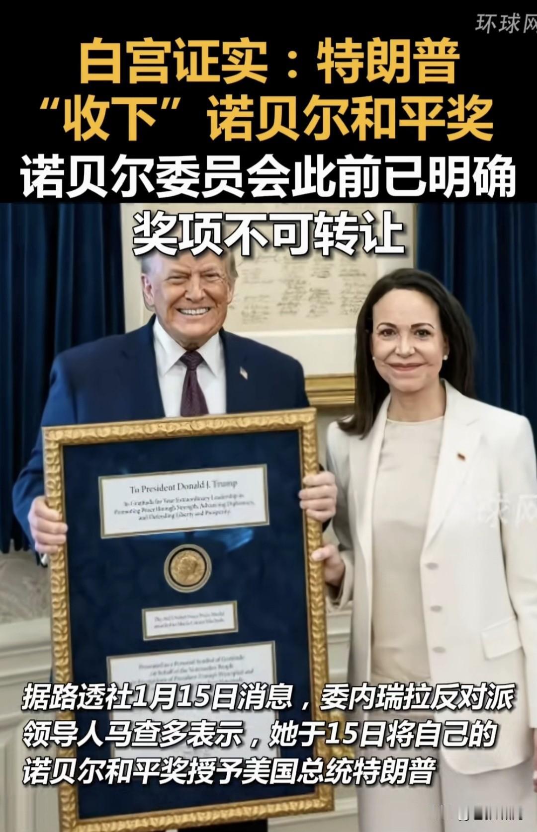笑喷!马查多把诺贝尔和平奖送老特,老特高兴得像小孩,嘴都合不拢了! 马查多获奖后,老特曾经牢骚,抱怨诺奖评委会与马查多,认为应该把这个奖颁给他,他的贡献比马查多大得多! 老特发兵抓马杜罗,马查多喜出望外,跃跃欲试准备回国掌权。川普“怀恨在心”,说国内没人支持别做春秋大梦! 马查多何等聪明人!早把事情看明白了。人情不如早做,干脆把这个“鸟奖”送给老特吧!反正人家还是承认她。 请看马查多赠送获奖证书的说辞:我把诺贝尔和平奖,转赠特朗普总统!是因他为委内瑞拉人民的自由民主,做出的独特贡献。这个贡献是不可替代的! 怪不得老特高兴!你看马查多手势与笑容,尤其那迷人飞吻!早已让老特神魂颠倒,忘了昨日怨愤,一笑泯恩仇! 若因马查多转赠“诺贝尔和平奖”,老特准许她回国执政,马查多岂不赚大了?当然没这么简单,还得代总统同意,举行全国大选。不管怎样好事要多磨! …………