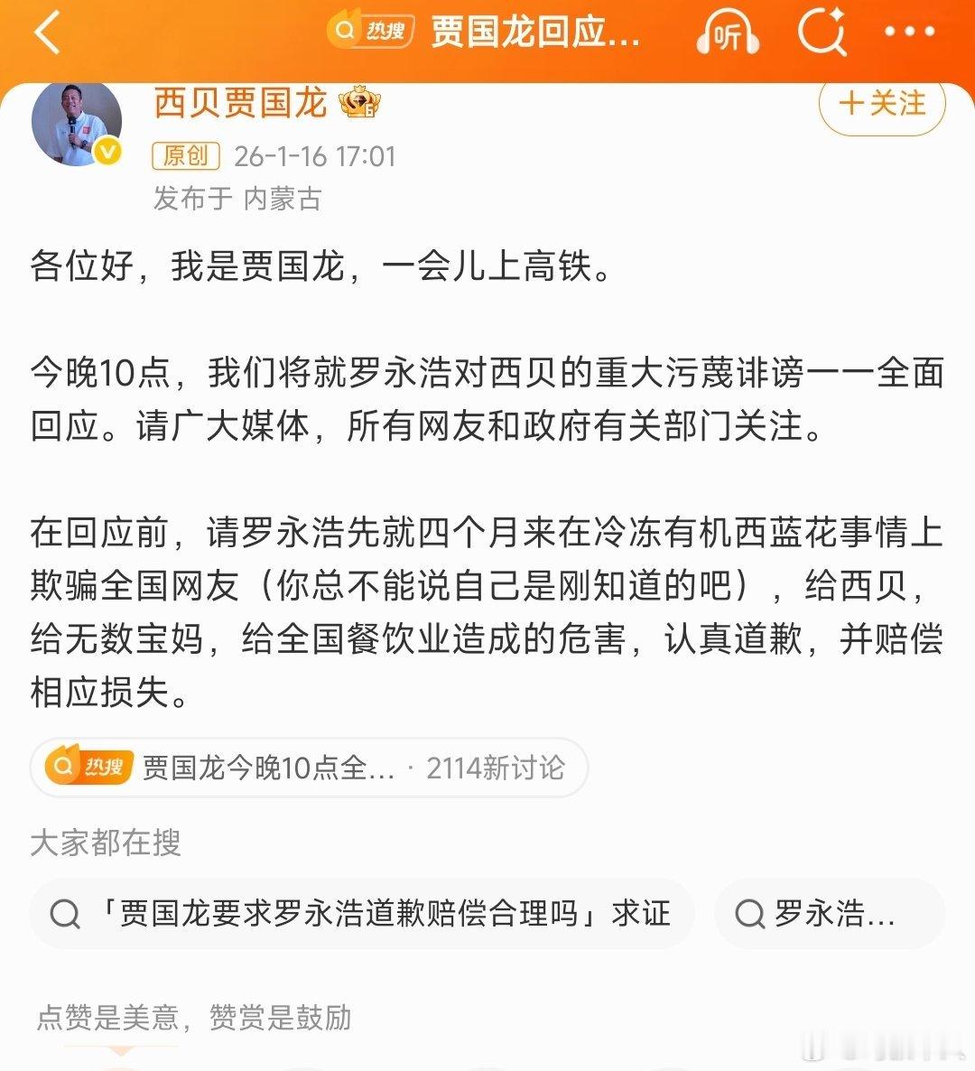 贾国龙今晚10点全面回应贾罗双方的朋友都别劝了!真的,贾老板和老罗这就是命中注定的一战!让他们开一场旷世直播一次性把事情彻底辩清楚,不然你们两边来回劝,双方都觉得自己忍让了,断断续续永远没完,你们就彻底放开让他们碰一次吧,全世界网友都来做陪审团,这不就能论清楚了?!是时候为这件事儿画上句号了……贾国龙要求罗永浩道歉并赔偿罗永浩西贝罗永浩