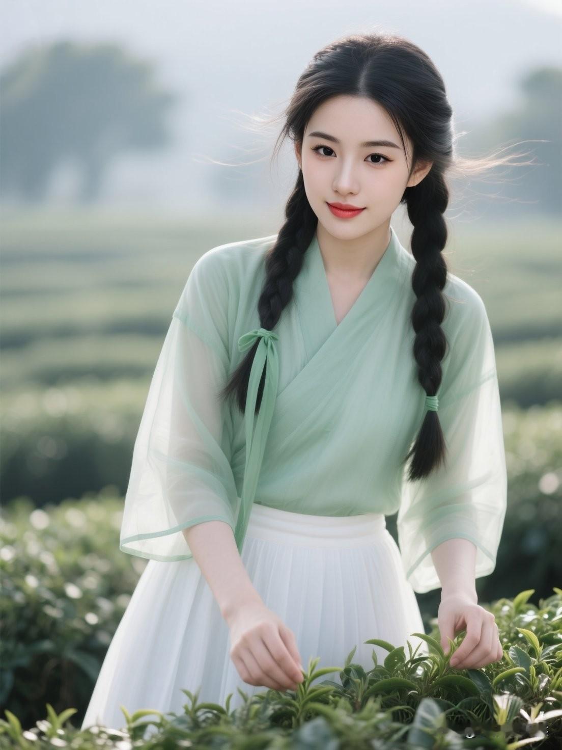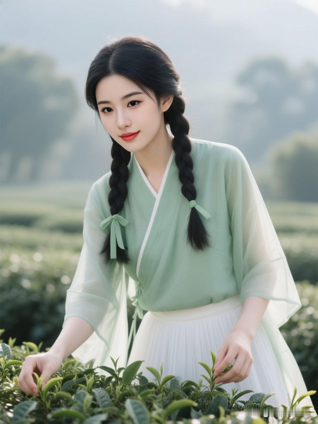 茶园绿意浓,少女采茶忙。一抹相思魂断处,念念不忘有相思。采茶姑娘写真茶园少女