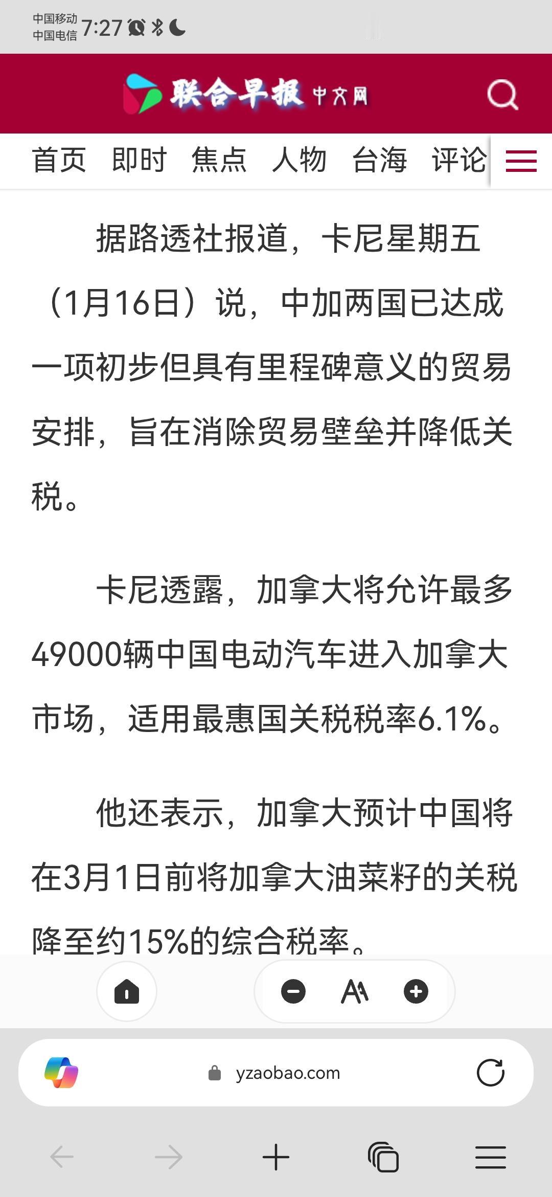 前所未有,加拿大做出巨大让步,中国电动车进入加拿大市场,适用最惠国关税待遇,只需6.1%!根据联合早报1月16日报道,卡尼在1月16日亲自发言称,中国和加拿大已经达成了一项里程碑式的贸易安排,同意中国电动车进入加拿大市场,适用最惠国关税待遇,税率只有6.1%。这个内容是令人震撼的,堪称前所未有! 要知道,在这之前,诸多发达国家都对我们的电动车,实施了高额的关税,比如欧洲对我们征收的关税,最高甚至能够达到45.3%,虽然后来经过贸易谈判,取消了这个高额关税,但是仍旧规定了一个最低价格,而这一次加拿大则是不同,没有规定什么最低价格,直接就适用最惠国待遇,把关税从之前高达106.1%的综合税率,下降到了6.1%。 需要指出的是,卡尼提到这一点时,还说只允许最高49000辆中国电动汽车进入加拿大市场,别看这个数字听起来不大,实际上对于加拿大这样的国家而言,这是一个巨大的数字,就算是特斯拉在加拿大的销量,每年销量只有5万左右,2023年是4.2万辆,2024年是5.5万辆,2025年则是暴跌,只有2.2万辆,这个的确没办法,加拿大毕竟人口不多,汽车销量有其上限。 不得不说,这个让步堪称巨大,堪称前所未有,令人震撼,谁也没有想到,加拿大直接来了这样一个大手笔。 而且,更加需要注意的一点是,这个协议才刚刚开始谈,未来还会有进一步的推进,在这个基础上,将这个49000辆的上限再提升一些,问题并不大。 只能说,这一次加拿大恐怕真的是想清楚了!之前加拿大可以说是唯美国马首是瞻,对我们做了很多过分的事情,逮捕孟晚舟,对电动车加征100%的关税,对钢铝制品加征25%的关税,他们满心以为这样能够得到美国的欢心,可事实上不仅没有,特朗普还对加拿大施加了非常巨大的压力,甚至叫嚣说要加拿大成为美国第51个州。 这样的经历,使得加拿大终于明白过来,跟美国一起混,不会有好日子过,因此接下来要怎样做根本不需要考虑,那就是做出最大努力,尽力修复好与我们的关系! 我们是最大工业国,我们有最尖端的技术,最优秀的产品,与我们合作,对于加拿大的经济来说,百利而无一害,其他国家可能还担心进口太多中国产品,会影响自己的制造业,可是加拿大根本不用担心这一点,因为他们本来就没有什么制造业,反而,他们是一个巨大的石油生产国,单单靠卖石油给我们,就能赚得盆满钵满! 之前加拿大石油基本上只有美国一个买家,美国下手也非常狠,仗着自己是加拿大唯一买家的地位,疯狂压价,加拿大其实早就已经不满很久了。 现在风向是真的变了!美国的盟友们,一个个都开始真正意识到了美国的真面目,从而开始采取更加独立的行动,选择与我们进行更加深入的合作,李在明带着庞大商业团队访华,菲律宾也对我们免签,加拿大这一次访华更是做出巨大让步……一个接着一个的国家,都逐渐开始清醒了!他们终于认识到了谁才是更好的合作对象!