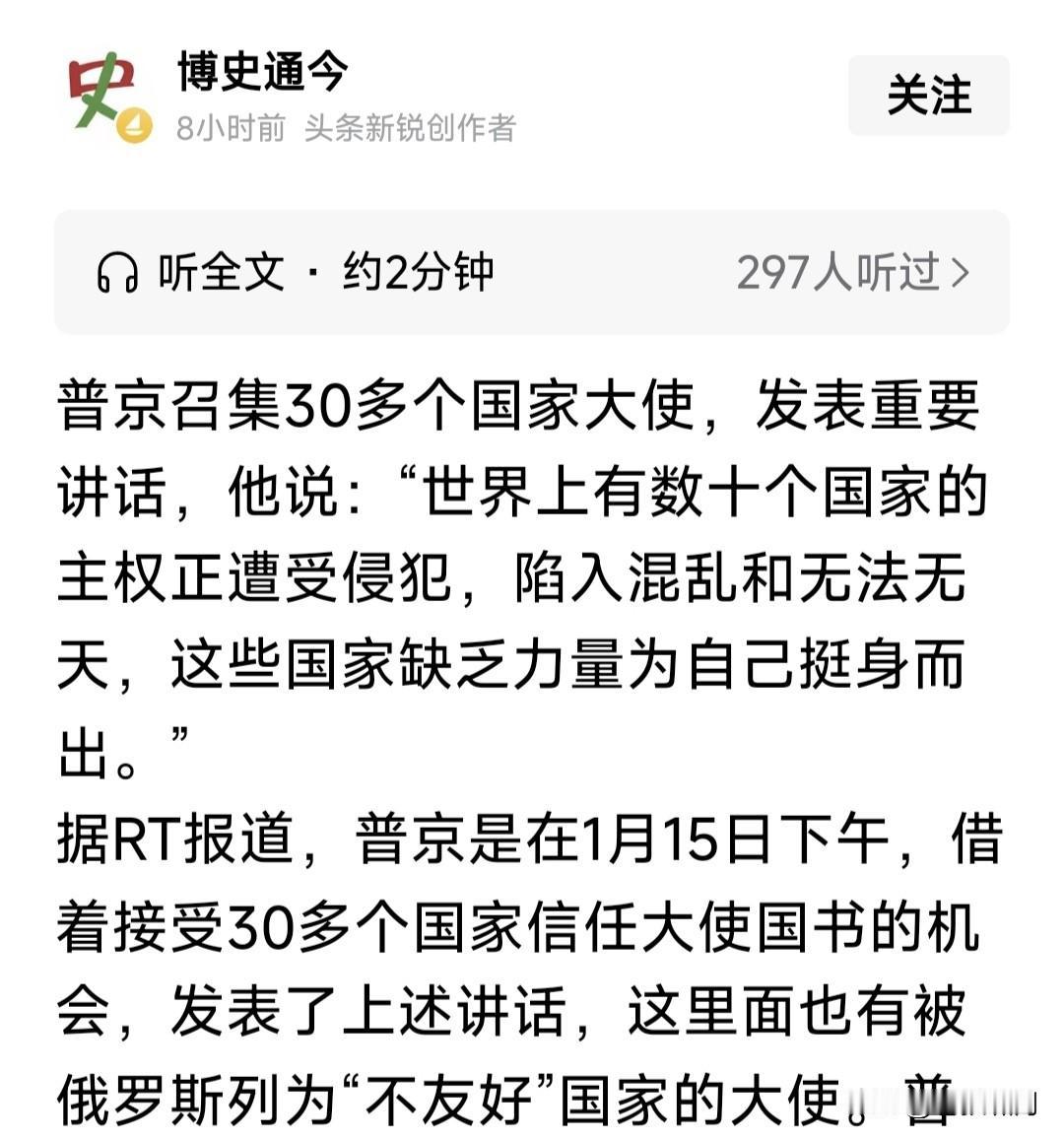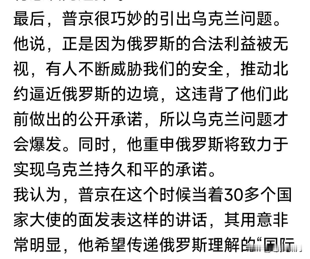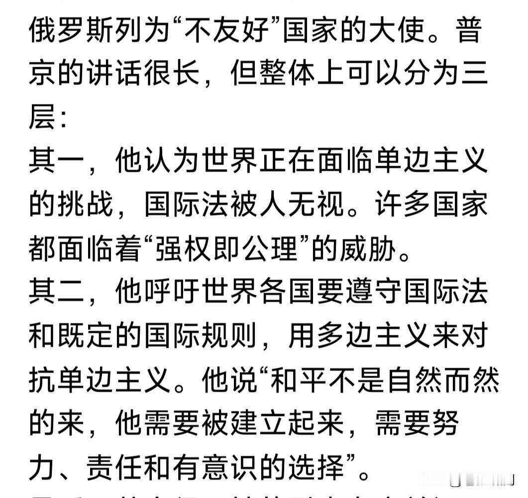 普京接受30多国大使国书!呼吁他们遵守国际法,尊重各国主权,不能牺牲他国安全,来保障自己的利益。 他说:世界上有数十个国家,主权正在遭受侵犯,陷入混乱和无法无天,这些国家缺乏力量,维护自身安全。 他的讲话很长,大致内容有几点: 1.世界面临单边主义挑战,国际法被无视,多国面临“强权即真理”威胁。 2.各国要遵守国际法规则,用多边主义对抗单边主义,保护自身利益。 3.俄就是因北约东扩,自身安全受到了威胁,因此才爆发了俄乌战争! 苍狼觉得普京总统讲的不错,但前两点用在俄身上,是否也十分合适? 第三点也有疑问:他说的北约东扩,指的是东欧国家加入北约吗?但北约实行申请制,没有申请怎么东扩?那些想加入北约的国家,为什么要加入? 就算乌申请入北约,威胁到了俄安全!但在乌之前,那么多东欧与苏联解体后独立国家加入北约!乌之后又有瑞典芬兰加入北约。俄为何没有行动,而只对提出申请的乌克兰采取行动呢? 司马昭之心路人皆知!事实已经证明一切。扯再多理由谁信呢?世间自有正义在,人心都有一杆秤。联合国宪章是准绳,尊重各国领土完整与主权是世界共识!坚信反侵略与反恐暴必胜! …………