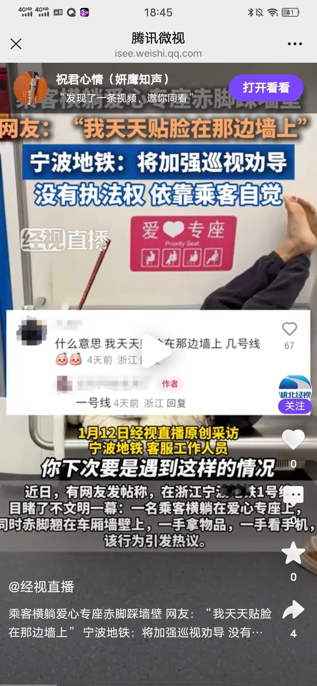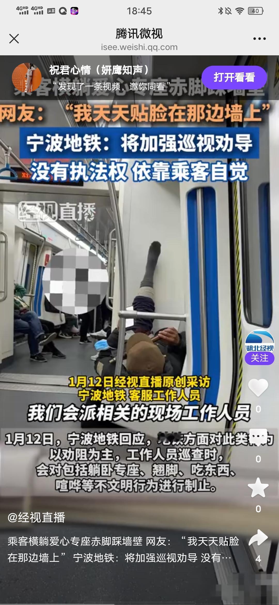 唉!让人心里膈应! 刚在经视直播看到这个报道,近日,有网友发帖称,宁波地铁1号线上,看到一名乘客横躺在爱心专座上,并且赤脚踩车厢墙壁,一手拿物品,一手看手机,这件事发出后,引起网友的热议,好多网友说“我天天贴脸在那边墙上”,表示很反感,后来宁波地铁回应说:她们对于这类行为以劝导为主,平时巡逻看到躺坐,翘脚,吃东西,大声喧哗等不文明行为,都会加以劝阻制止,也表示,后期,乘客朋友们发现这类行为可以给他们打电话,她们会加强巡视,他们没有执法权,主要还是要依靠乘客们自觉! 确实,这样的不文明行为,还是得靠大家自觉,靠各位的公德心,靠各位的高素质,毕竟这是公共场合,不能只考虑自己的安逸,舒服,得想想别人的感受,如果在你自己家里,那随便你,你想怎样就怎样,因为不会给其他人造成困扰和不适,不会伤害到其他人,所以,我们生而为人,还是要拿出高等动物应有的素质,不能因为素质低下,自己降低自己身份与低等生物混为一貉。