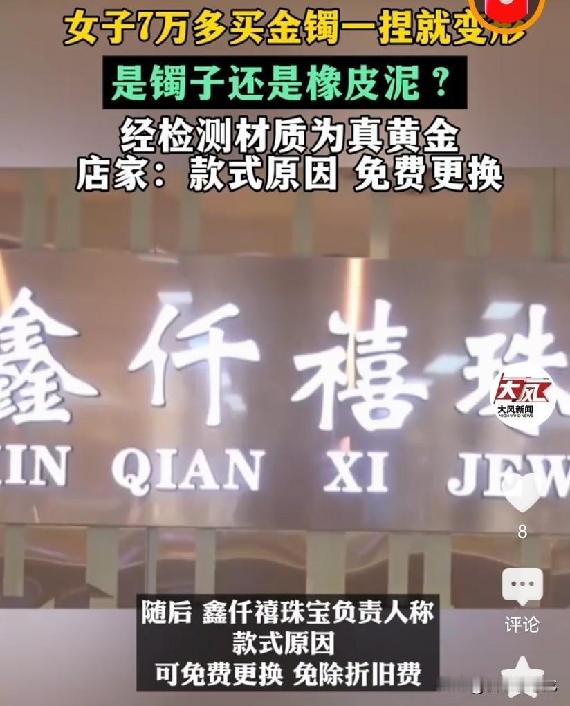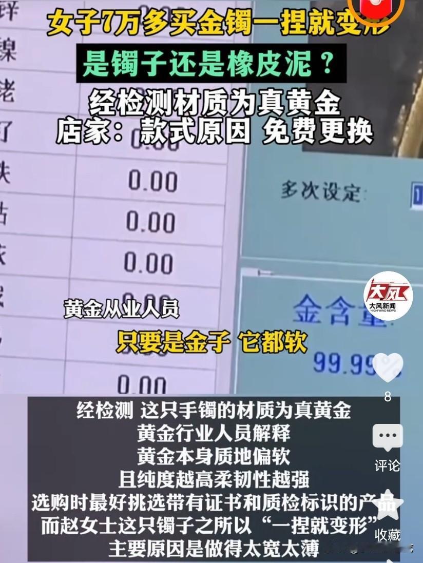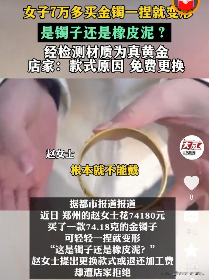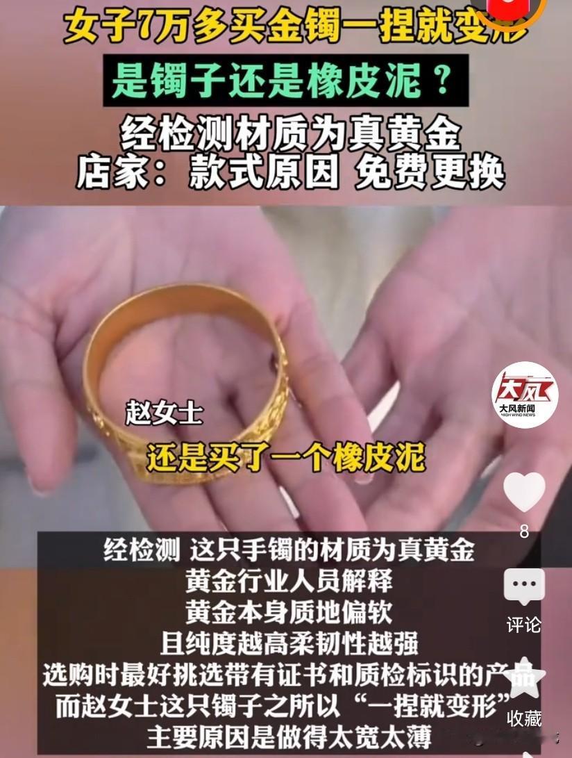 真离谱!浙江一女子看上一个手镯,花了7万多,没想到戴了几天,足金手镯轻轻一捏就变形了。她气冲冲地找商家讨说法,对方却称高纯度黄金,质地偏软、变形是正常现象。女子满脸质疑,觉得7万多买的镯子这么“娇气”,实在说不过去。 女子攒了好几年的积蓄,就想入手个靠谱的足金手镯,既能日常佩戴撑场面,还能当传家宝保值。商家在柜台一个劲夸这款镯子纯度高、工艺好,沉甸甸,有质感,她越看越喜欢,咬咬牙就付了钱。 谁知道戴了还不到一个星期,那天她整理头发,手指不小心碰到镯子,就轻轻捏了一下,原本圆润的镯身直接凹进去一块,怎么掰都掰不回来。 找到商家时,她把变形的镯子拍在柜台上,要求退货或者换货。店员看了一眼,轻描淡写地说了一句“足金就是这样”,还拿了块金条演示,用手一弯就变了形。高纯度黄金密度软,日常佩戴难免会有磕碰变形,不属于质量问题。 女子听得火冒三丈,反驳说自己戴的时候格外小心,根本没磕没碰,就是轻轻一捏就坏了,这要是正常,那买回家难道得供起来? 她要求商家拿出检测报告,证明镯子纯度没问题,可商家只肯口头保证,迟迟不肯提供实质证据。 懂行的人都知道,足金质地软确实容易变形,7万多的高价手镯,工艺上应该会做加固处理。商家在售卖前就必须明确告知消费者。 消费者花大价钱买黄金,图的就是放心耐用,就算知道足金软,也没想到一捏就变形。商家不能光拿“材质特性”当挡箭牌,更该反思自己的服务和产品工艺。 花钱买东西,尤其是贵重物品,消费者有权知道产品的所有关键信息。希望商家能多些真诚,少些套路,别只想着卖货,把该说的风险都讲清楚,才能避免矛盾。
