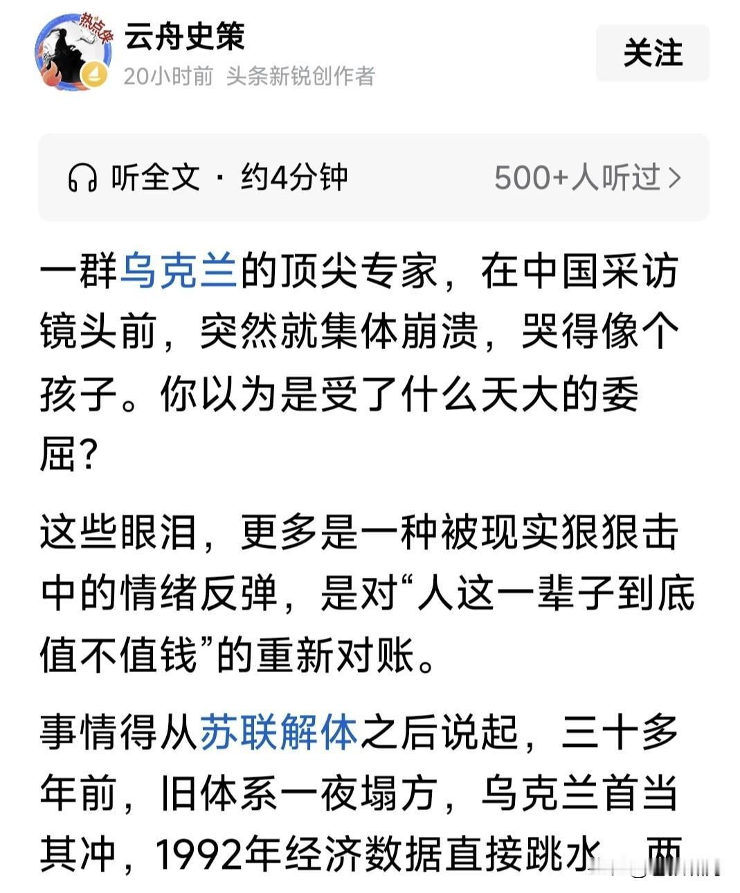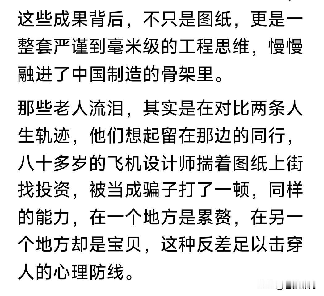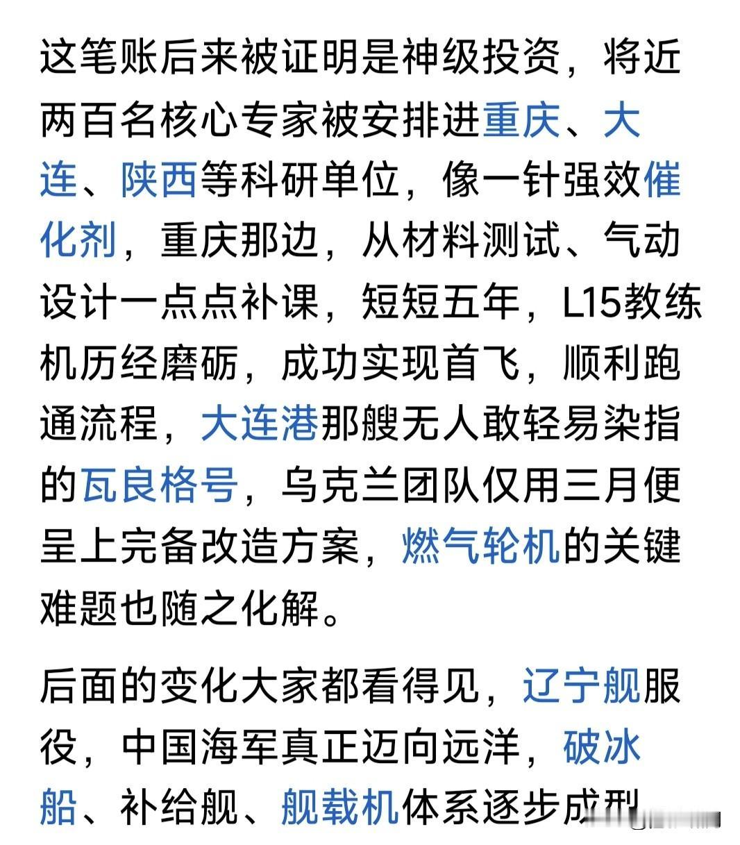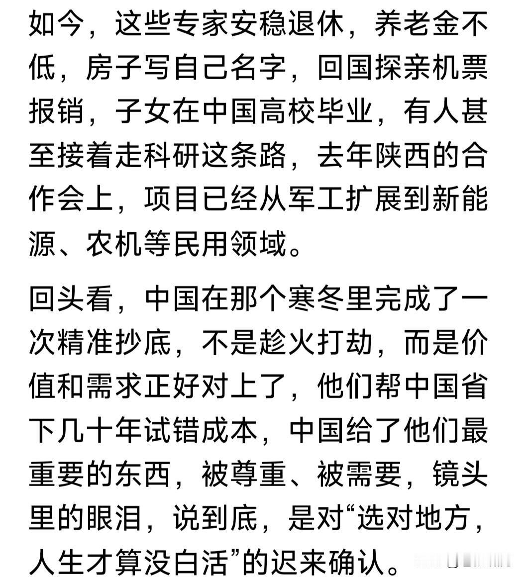 这些乌军工专家,为何面对镜头感动落泪?网友此文为你介绍:他们来华前后的不同境遇,以及中国航母,舰载机与配套舰船的艰难建造之路。 此文说到苏联解体,乌军工科研与生产废弃,不少顶尖专家与技术工人,沦为无用之人。许多人生活没有着落,不得已以打零工勉强维持生计。 恰逢中国改开后,发展经济强大国防,急需高端军工科研与技术人才。于是以相对优越的物质生活条件,邀请他们分批来中国参加科研与建设。 经过他们的帮助与中国企业共同努力,中国军工得到长足发展。最令人注目是中国航母建造成军,辽宁舰山东舰福建舰相继入列,舰载机与配套舰艇相继完善,已形成强大的战斗力。 几十年过去,这些当初来中国的乌专家都已步入老年。中国为他们的退休生活提供很好的物质条件。衣食住行子女教育,回国探亲报销机票。他们的子女大都留在中国,继续做贡献。 网友说的他们面对镜头落泪,就是被记者问到来中国前后的生活际遇,不由感慨万千,留下感动的泪水! 苍狼在此想说,中国军工能得到迅猛发展,航母编队形成战力,既有中国军工人艰苦努力,也有像乌专家这样外国朋友助力。这些都不能忘记! …………