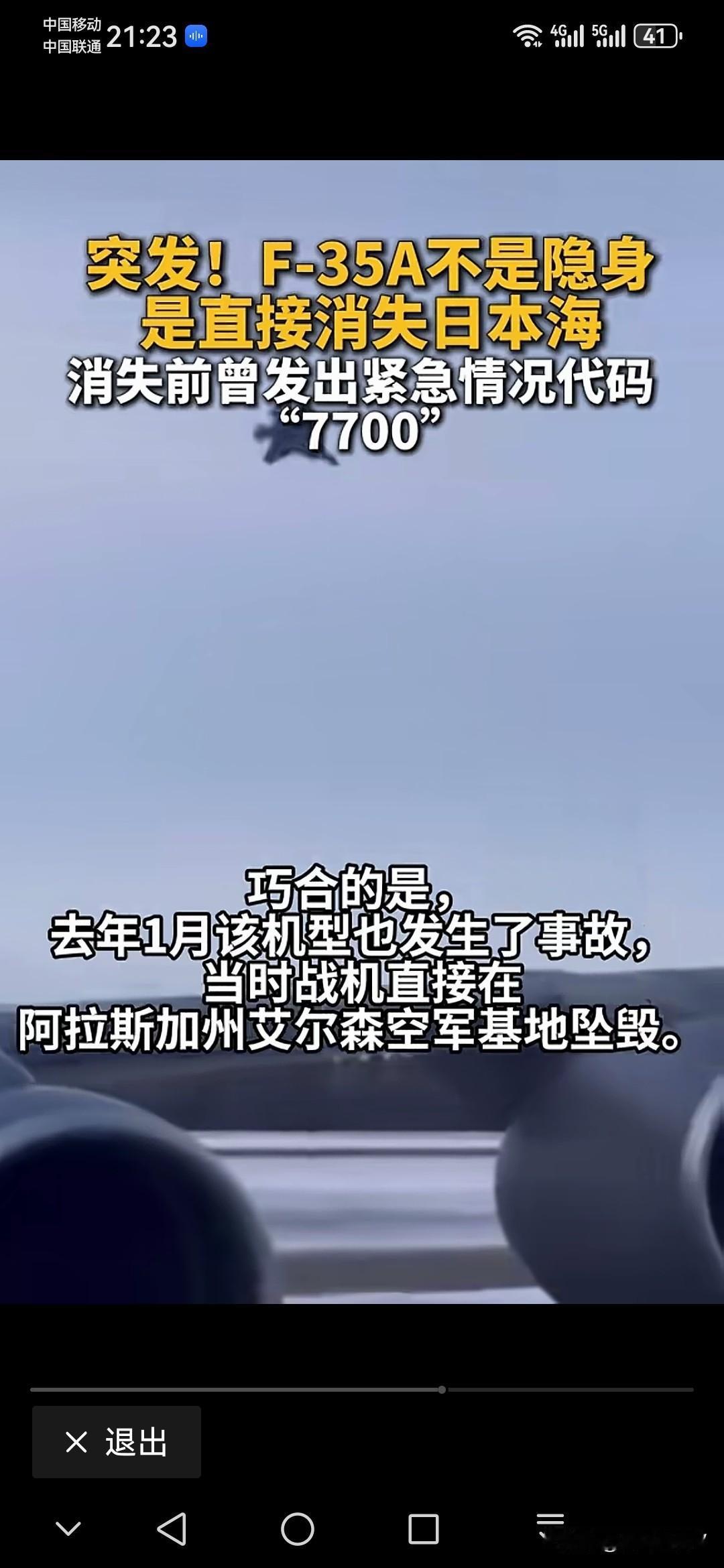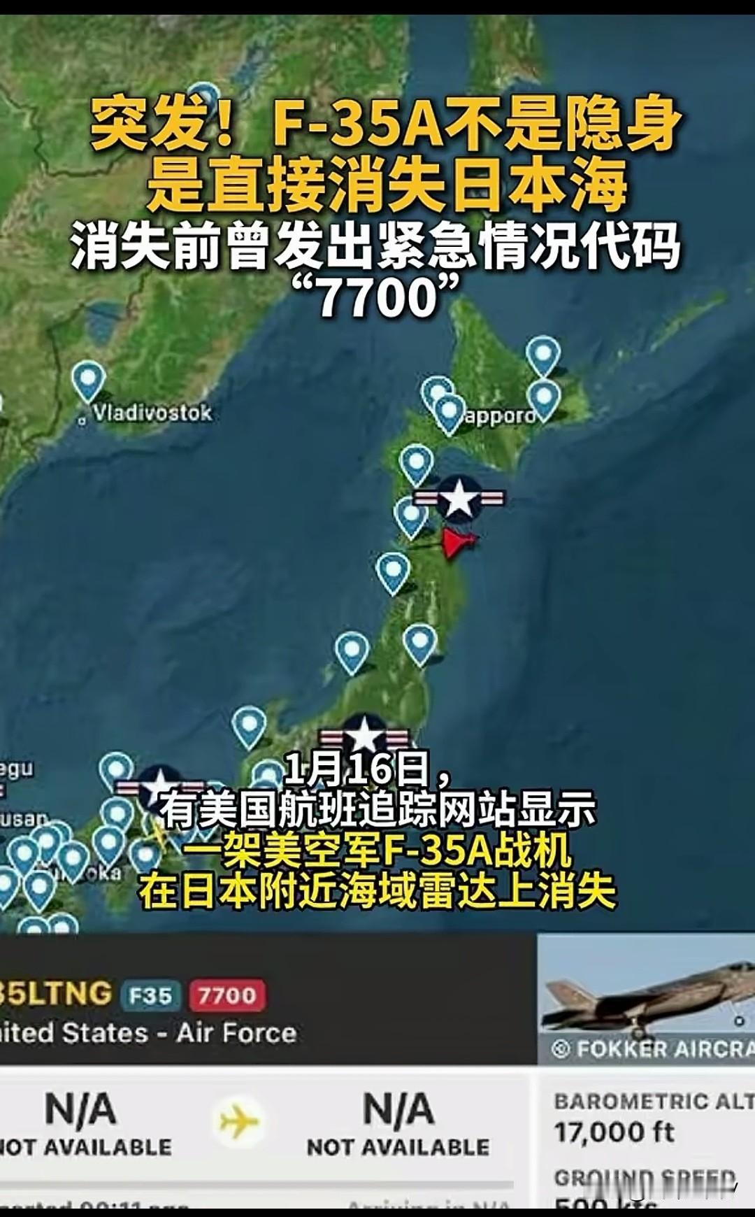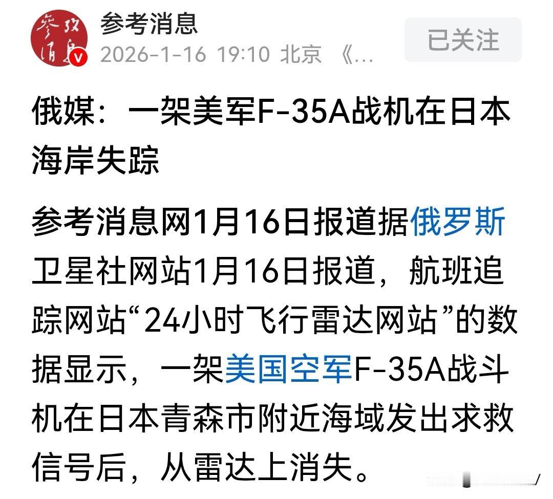今天(1月16日)最炸裂的突发新闻! 参考消息网和俄罗斯卫星社同步报道,1月16日上午,航班追踪网站“24小时飞行雷达”(Flightradar24)的数据突然传来惊悚一幕!一架美国空军F-35A“闪电Ⅱ”战斗机,在日本青森市附近海域上空发出紧急求救信号后,ADS-B信号瞬间中断,彻底从雷达屏幕上消失得无影无踪! 截至现在,事发已经过去近10个小时,美日双方居然集体沉默,没有发布任何官方通报,这种反常的安静背后,藏着多少不为人知的隐情? 先给大家还原一下事件的关键细节:这架F-35A从日本海北部起飞后,原本沿着既定航线向东飞越本州岛,在青森以南空域完成转向,朝着东北方向飞行,看得出来是在执行常规训练任务。但就在北京时间11时09分,战机突然发出了国际通用的紧急代码7700,懂航空的朋友都知道,这个代码意味着机上发生了足以威胁生命安全的突发状况,是最高级别的求救信号!可谁也没想到,信号发出后没多久,战机的位置监测就彻底中断,没有留下任何后续轨迹,仿佛凭空消失在了茫茫大海上。 更让人“揪心”的是飞行员的处境!1月份的青森海域,海水温度只有7到9摄氏度,这种刺骨的低温下,哪怕穿着专业救生服,人体也会在短时间内出现失温症状,超过数小时后生还希望就会急剧下降。事发后,美军印太司令部、日本航空自卫队和海上保安厅虽然紧急启动了联合搜救,派出多架侦察机和巡逻艇拉网式排查,但目前只找到少量疑似战机尾翼的碎片和海面油污,既没发现完整残骸,也没探测到飞行员的求救信号,情况真的太不乐观了。 而最让人“脊背发凉”的是,这已经不是青森海域第一次发生F-35A的悲剧了!还记得2019年4月9日吗?日本航空自卫队一架F-35A也是从附近的三泽基地起飞后不久失联,最终确认坠毁,41岁的飞行员细见彰里少校遇难,遗体过了两个月才找到部分残骸。当时调查结果显示是飞行员夜间飞行出现“空间定向障碍”,连求救信号都没来得及发。如今同一海域、同一款战机,历史竟如此相似地重演,很难不让人怀疑这款战机的可靠性! 更值得关注的是,这次出事的区域可不一般!青森附近的三泽基地是美军在日本北部的核心据点,还是美日共用基地,日本自卫队也在这部署了F-35A。按照美军原计划,2026年春季就要向这里批量部署48架F-35A,替换老旧的F-16,和阿拉斯加的战机形成北太平洋隐身防线。现在突发事故,日本已经紧急下令停飞所有同型号战机,美军的部署计划恐怕要彻底打乱,盟友对这款战机的信心也难免动摇! 反观咱们中国的隐身战机,歼-20、歼-35自服役以来从未发生过一起坠机事故,可靠性经过了实战化训练的充分验证。这背后既有成熟的制造工艺和严格的质量管控,也离不开完善的维护保障体系——毕竟战机是用来保卫国家的,不是拿来“高危炫技”的,稳定性才是硬道理! 不得不说,美军在亚太地区高强度的部署和训练,看似在秀肌肉,实则不断暴露自身的短板。这起事故不仅是一次装备损失,更可能成为美军调整亚太战略的转折点。