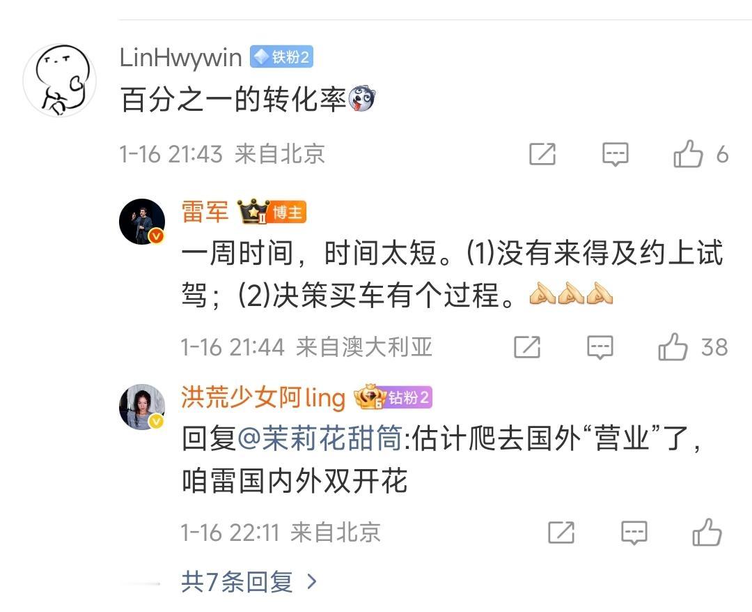 百分之一的转化率已经很难得了,一周的时间,小米汽车"'销售顾问"雷总"卖出去"2台车。雷总的回复很实在,一周时间太短,没来得及约上试驾,决策买车有个过程。 只能说这才是最真实的购车过程,上来看都不看直接买的,只有两种,一个是实在不缺钱,另一个就是朋友亲戚买了,体验过并且认准了。 否则试驾比较就是必须的,所以这才是真实的购车过程。
