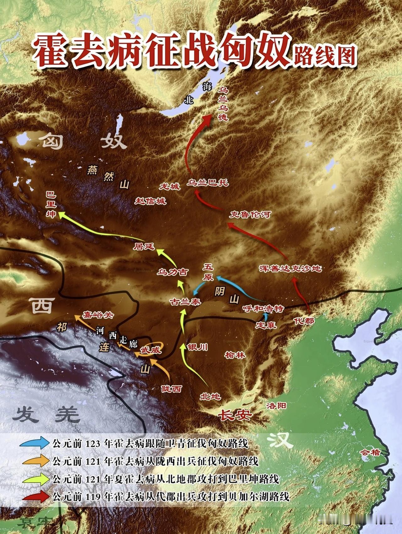 一代名将霍去病征战匈奴路线图,霍去病一生只活了24岁,18岁以剽姚校尉率800骑首次出战,就斩敌首级2000人,封冠军侯,20岁任骠骑将军歼灭收降匈奴近10万,取得河西大捷,并扩土四郡,打通丝绸之路;漠北决战歼匈奴左贤王部7万余人,封狼居胥而还,之后与卫青同任大司马,名爵与官职达到顶点。 霍去病24岁英年早逝,从崭露头角到功成名就,6年的经历比绝大多数人的人生都要精彩,比爽文主角更像主角,虽然如彗星一般转瞬即逝,却留下了永远的历史传说。 历史 历史地图