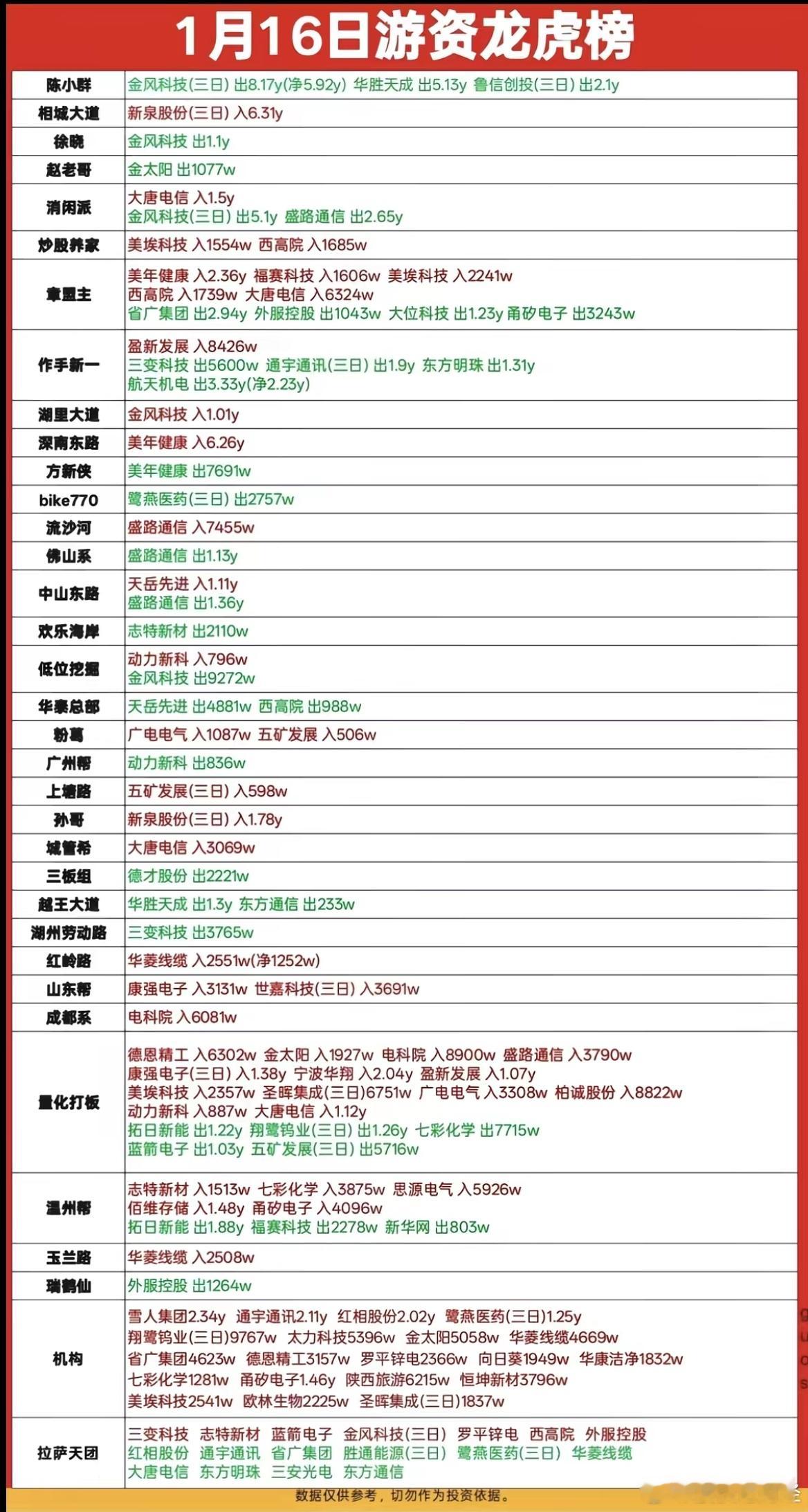 "1月16日龙虎榜看看柚子都买了什么游资动向速览:陈小群减持金风科技,章盟主