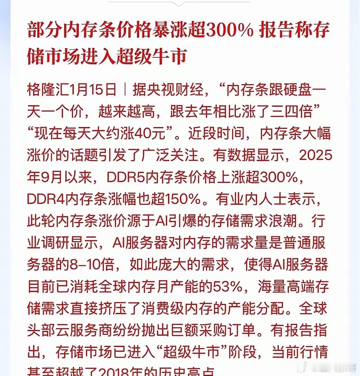 存储芯片进入了“超级牛市”,有部分内存条价格暴涨了300%。一、目前是内存和硬盘都在涨,已经是去年同期的三到四倍。二、上涨的逻辑是Ai引爆的存储需求。Ai服务器需求是普通服务器需求的8-10倍。全球云服务商纷纷抛出巨额采购订单。三、存储芯片涨,还有一个原因,就是高端芯片只有几个厂商生产,主要是集中在大漂亮和棒子,美光、西部数据、海力士、三星电子等。四、从国内看,生产高端芯片最厉害的是长鑫存储,目前还没有上市,但是25年12月已经启动了上市辅导,很快就会上市,可以重点关注这条产业链。