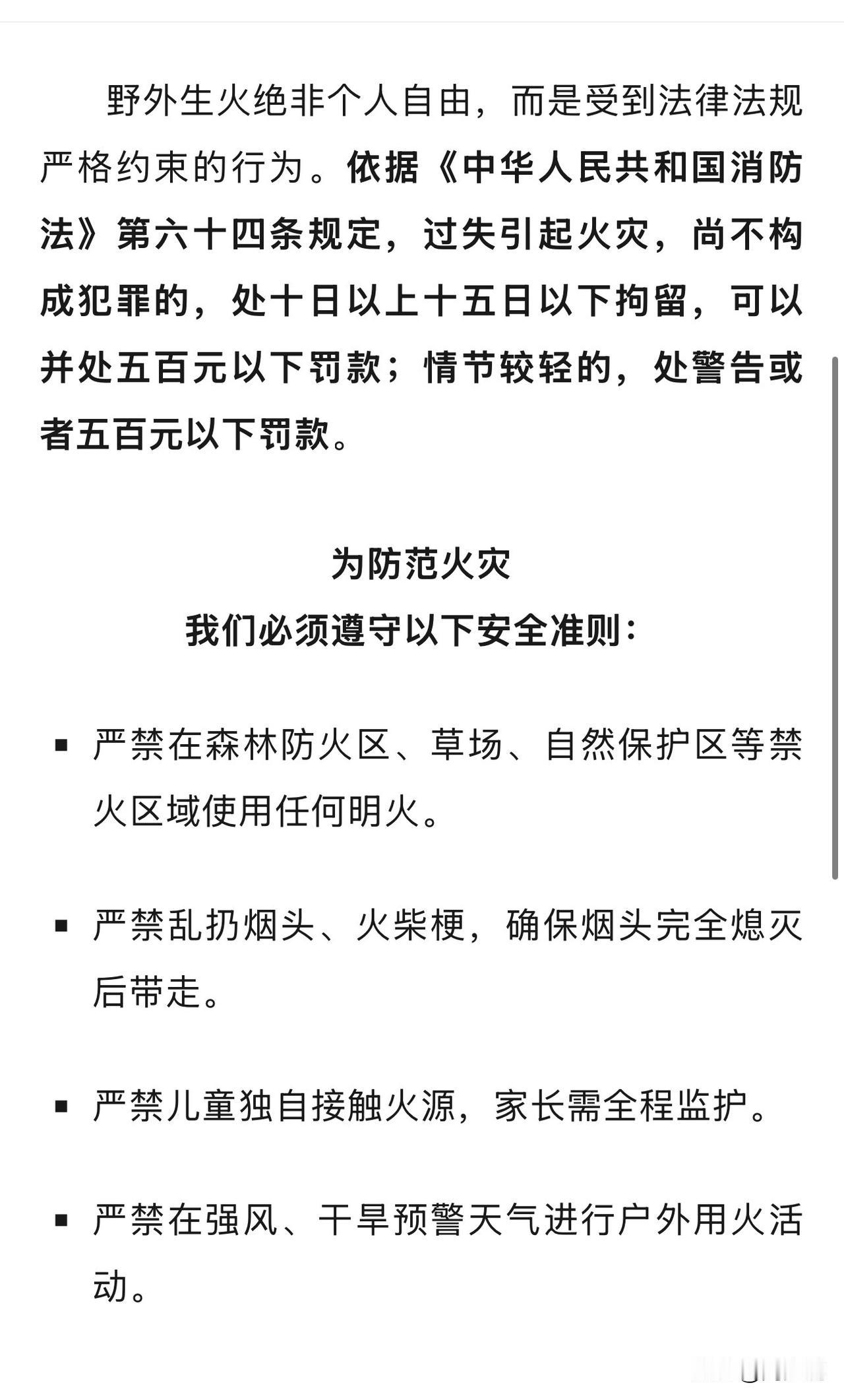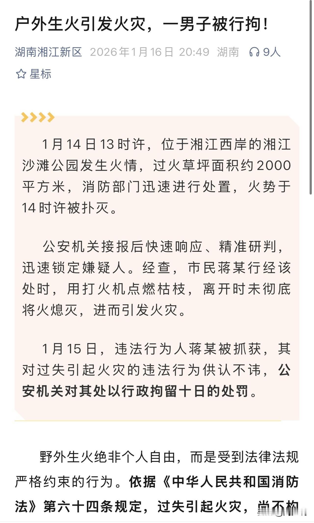 “一个小动作酿大祸!”据媒体报道,近日湖南湘江西岸湘江沙滩公园突发火情,过火草坪面积约2000平方米,消防部门紧急处置,火势于14时许被扑灭。经查,蒋某行经此地时用打火机点燃枯枝,离开时未彻底灭火,最终引发火灾。目前,蒋某被抓获,对违法行为供认不讳,并且被处以行政拘留十日的处罚。 此事曝光后引发网友热议,有网友直言:“一个随手的侥幸,毁了一片绿地,还把自己送进拘留所,得不偿失!” 也有网友感慨:“防火不是口号,每一个小疏忽都可能酿成大灾!” 看完这事,在周少看来,这真是一个小动作给自己酿了个大祸,被处以行政拘留十日的处罚,确实有些得不偿失,也是咎由自取。 从教育角度来看,这起事件给所有人敲响了警钟。野外用火绝非“个人小事”,而是关乎公共安全的大事。很多人抱有侥幸心理,觉得“点个枯枝没什么”,却忽视了天干物燥的环境下,哪怕一点火苗都能引发巨大火灾。 周少建议所有家长以此为契机,向孩子、向身边人传递“防火无小事”的理念,既要普及《消防法》的相关规定,更要培养每个人的责任意识。 正所谓安全无小事,防火记心间,唯有从思想上重视、从行动上落实,才能真正守护好我们的绿水青山和公共安全。#寻美三湘# #长沙新朋友#