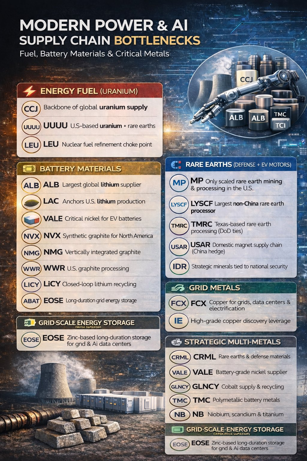 美股材料与供应链相关企业(板块都涨了很多,估值很高,这里只是做个记录,不做推荐):一、能源燃料(Power comes first)AI 数据中心、军工体系、先进制造,最终都绕不开核能。$CCJ全球铀供应的核心骨干,直接受益于核电复兴。$UUUU美国本土铀矿 + 稀土双重暴露,能源安全叙事下的关键资产。$LEU核燃料浓缩是真正的“卡脖子环节”,这是最容易被低估的节点。二、电池材料(AI + 储能 + 电动化)没有电池材料,谈不上电力的规模化调度。锂(Lithium)$ALB —— 全球最大锂供应商$LAC —— 美国锂生产的战略锚点镍(Nickel)$VALE —— 具备全球规模的电池级镍供应能力石墨(Graphite)$NVX —— 北美合成石墨$NMG —— 去中国化的垂直一体石墨$WWR —— 美国本土石墨加工回收 / 材料安全$LICY —— 闭环锂回收$ABAT —— 电池回收与材料再生这不是环保主题,而是供应链韧性主题。三、稀土(国防 + 电机 + EV)几乎所有先进武器、无人系统、电机,都离不开稀土。$MP美国唯一具备规模化“开采 + 处理”的稀土公司。$LYSCF最大非中国稀土加工商。$TMRC德州稀土处理,与国防部深度绑定。$USAR美国本土磁体供应链,典型的“中国对冲”。$IDR战略矿产,与国家安全直接相关。四、电网金属(数据中心隐形瓶颈)算力不是建在云里,是建在现实世界的电网之上。$FCX铜是电网、电气化、数据中心的绝对核心材料。$IE高品位铜资源,具备发现与扩张弹性。五、国防关键金属很多人不知道,一些金属的“可替代性几乎为零”。$UAMY美国为数不多的锑供应商,直接关系弹药与军工。$NVA通过美国项目获取锑暴露,稀缺性极强。六、战略多金属(去风险化组合)$CRML稀土 + 国防材料组合。$TMC不依赖陆地采矿的电池金属方案。$NB铌、钪、钛——先进材料体系的核心元素。七、电力使能(Power Enablement)有电还不够,还要能“存”。$EOSE锌基长时储能,直接服务 AI 与数据中心的电网稳定。