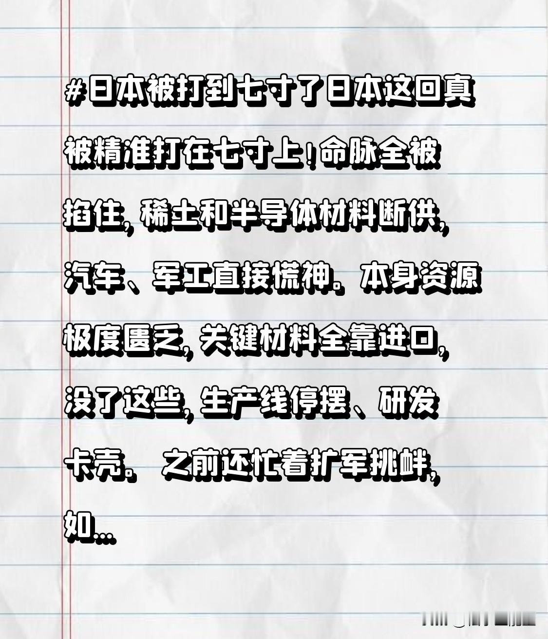 日本这回真被精准打在七寸上!命脉全被掐住,稀土和半导体材料断供,汽车、军工直接慌神。本身资源极度匮乏,关键材料全靠进口,没了这些,生产线停摆、研发卡壳。 之前还忙着扩军挑衅,如今盟友靠不住,替代路难找,GDP下滑、企业巨亏,妥妥自作自受,被戳中命门一点不冤!