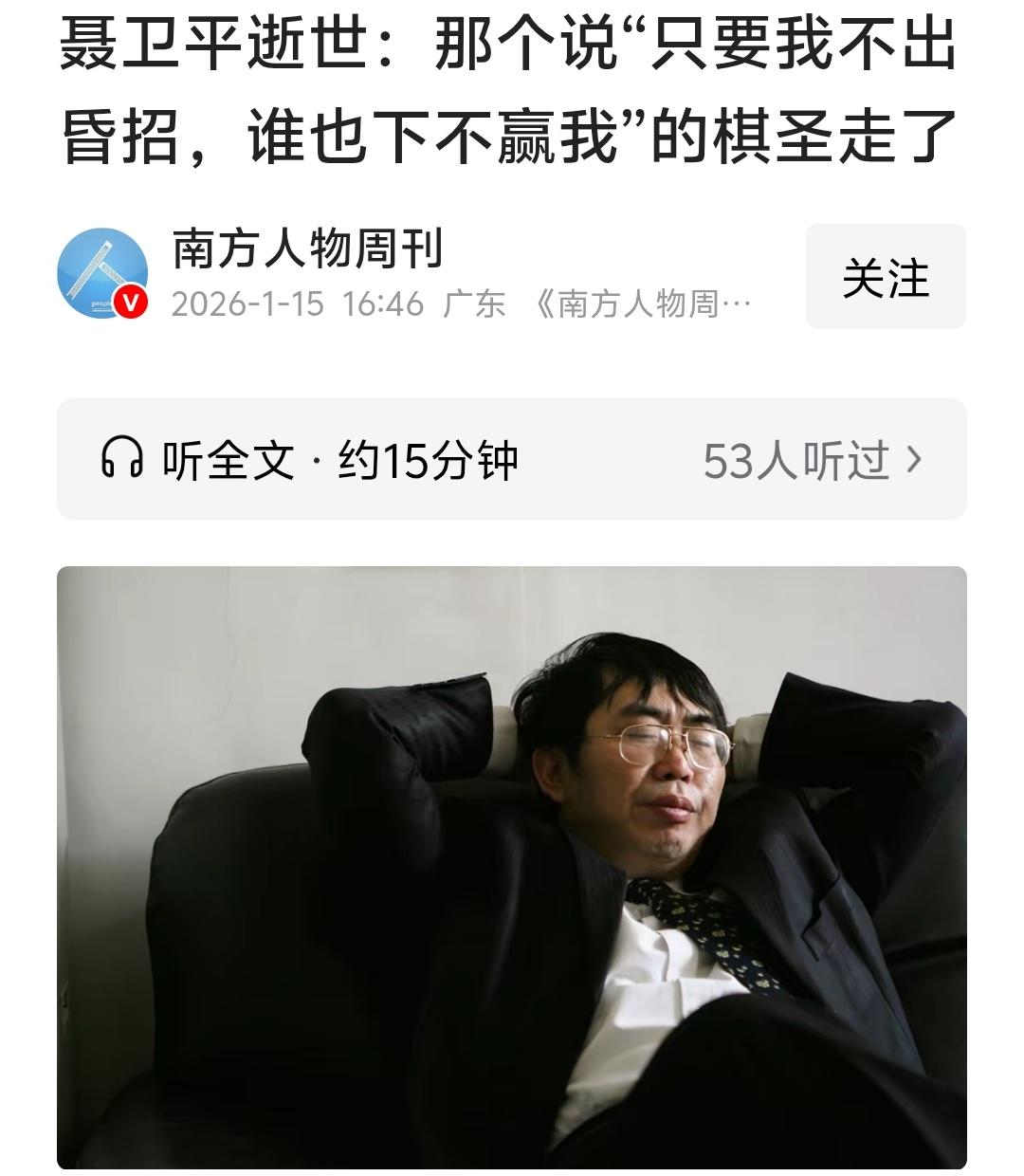 聂棋圣走了,怀着沉痛的心情读了他女儿发的讣告全文。如今,能让俺开心忧伤的事俺自己明白,说实话,这是俺爹妈等亲人仙去后,最伤感的一件情感悲思了。一切真正为国为民有功之人,老百姓心里都有帐本。聂棋圣是聂家的圣人,也是中国的圣人,老百姓心里的圣人。聂棋圣用他的生命给中国人上了一堂生动的哲学课,凡事把握度,度的面前圣人也是人,度的面前,凡人指定不是圣人。