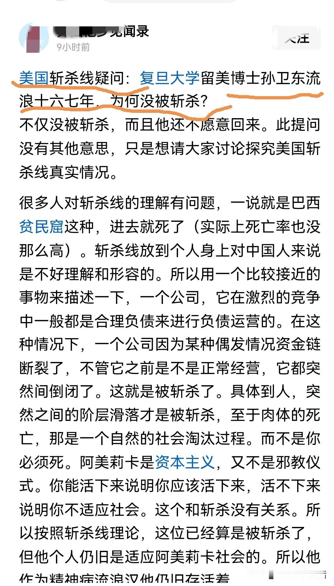 牢A在国内只要低调点,目前还是算安全,《新华社》都开始刊文《斩杀线》的问题了,说明他的研究方向是没有问题,并且也是得到很多大佬的认可的,不然也不会这么顺利的回国。 现在质疑声已经开始出来了,如果不是有官方给站台,估计就不是质疑这么简单了吧,在国内被人肉的成本有多低,一定超过很多人的认知。 所以现在牢A可以直播,但是不要露脸和透露太多的个人信息,那些被他断了财路的人,早就磨刀霍霍了。 这位质疑者拿出孙卫东流浪十多年做例子,意思是说他没死就不算被斩杀,那些死掉的人是自然淘汰的规律,是老天不让你活,你已经不能适应这个环境了,是自己个人的问题,和美国政府没有任何关系,真的看到人头皮发麻。 其实孙博士早就已经社会性死亡了,要不是几个好事的“中国人”把他抬出来,孙博士是不是还活着,美国人早就没有人知道他了,当然他死了美国人也没有人知道他什么时候已经死了。另外中国人也不知道他是活着还是死了,甚至他在中国的家人也不知道他是不是还活着。他能活多久就是他个人的事情了,也许就像现在这样活到90岁,也许这个冬天没有熬过去,就看孙博士的身体状况和生命力了,最重要的是还有多少人愿意接济他,如果没有华人和他那些同学的接济,孙卫东或许早就只是一个名字了而已,不过现在这都不重要,因为没有人会在乎了。 在美国斩杀线,为什么说华人相对来说好一点,因为他们完美避开了2个天坑,第一是学贷和各种贷款,基本上华人去美国要么已经完成了学业(还有就是带着奖学金或者助学金去的),要么家里有矿不差钱,其次是天价医疗,大多数华人生病了都第一时间回国看病的,而且华人基本上从小就有储蓄的习惯,很少会月光。另外华人为了活着,啥活都能干,啥苦都能吃,就算是乞讨也不能让自己饿死。 希望更多的牢A能够站出来,让那些省吃俭用攒钱凑学费,送子女出去的父母看清楚,他们追求的到底是什么,他们把自己的孩子交了了什么样社会去历练。