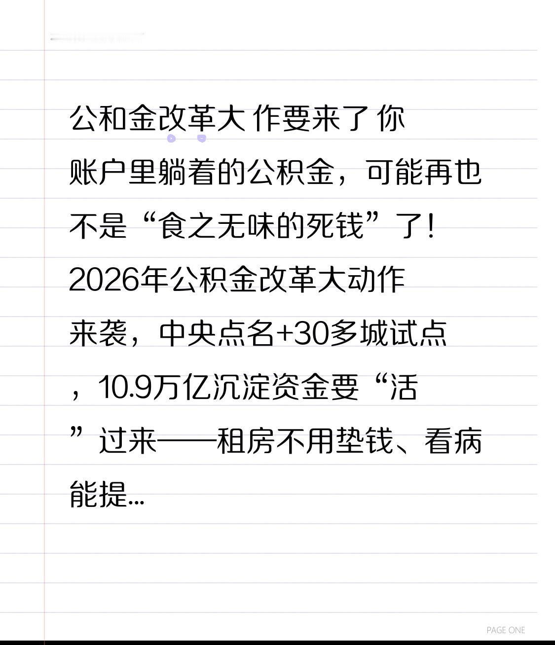 公和金改革大 作要来了 你账户里躺着的公积金,可能再也不是“食之无味的死钱”了!2026年公积金改革大动作来袭,中央点名+30多城试点,10.9万亿沉淀资金要“活”过来——租房不用垫钱、看病能提、装修直接花,甚至给父母买房都能用,这波福利千万别错过! 以前咱吐槽公积金:不买房就只能看着钱贬值,存款利率才1.5%,跑不赢通胀;想提取要跑断腿,租房提取额度低得可怜。但这次改革彻底颠覆玩法,核心就一个:把“购房互助金”变成“民生保障金”! 关键转折来了:过去公积金只能绑着房子转,现在直接突破“住房”边界!北京、广州等城市支持“直付首付”,不用自己垫资;石家庄租房年提取上限提至2.1万,深圳能提80%账户余额;更狠的是成都、海南试点重大疾病提取,配偶父母看病都能用上这笔钱,相当于多了份家庭应急金。 三类人直接受益: 1. 租房族/无购房计划者:赶紧按最高额度提取,1.5%的存款利率不如拿去理财,防止资产缩水; ​ 2. 购房者:用公积金直付首付省现金流,多孩家庭贷款额度上浮25万,2.6%的利率比商贷省40万利息; ​ 3. 灵活就业者:外卖员、自由职业者能自愿缴存,还能领财政补贴,买房也能享低息贷款 。 更方便的是,线上3分钟审核,T+1到账,异地转移不用跑,13项业务全国通办。 这场改革不是小打小闹,是把10万亿“死钱”变成你的租金、医药费、装修费。以前觉得公积金是“富人福利”,现在中低收入者、新市民都能享实惠。赶紧查下你所在城市的新政,看看租房提取上限涨了多少,商转公能不能办——自己的钱,就得用在刀刃上!评论区说说你打算怎么用这笔钱,点赞收藏,转发给身边需要的人~