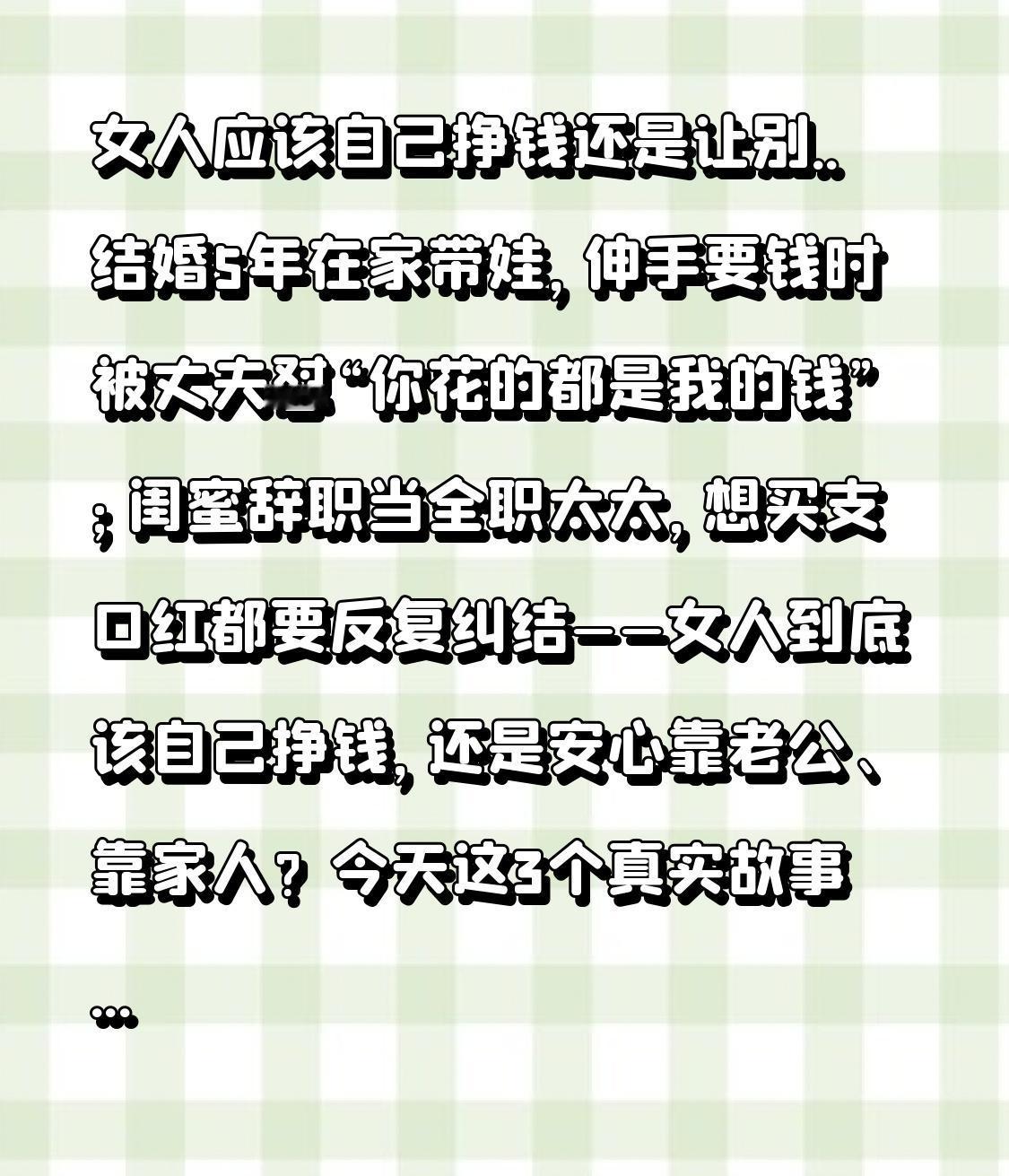 女人应该自己挣钱还是让别.. 结婚5年在家带娃,伸手要钱时被丈夫怼“你花的都是我的钱”;闺蜜辞职当全职太太,想买支口红都要反复纠结——女人到底该自己挣钱,还是安心靠老公、靠家人?今天这3个真实故事,可能会颠覆你的想法! 身边总有两种声音:有人说“女人干得好不如嫁得好”,找个靠谱的人依靠,不用风吹日晒多轻松;也有人喊“经济独立才是硬骨气”,手心向上的日子永远没尊严。其实这事儿根本没有标准答案,但有个底线必须守住:你得有“随时能自己挣钱”的能力。 我表嫂就是个例子,前几年听信“我养你”的承诺,辞掉高薪工作在家备孕,结果孩子刚满1岁,丈夫生意失败性情大变,她想买罐进口奶粉都要被骂“败家”。最绝望的时候,她发现自己脱离社会太久,连面试都紧张到语无伦次。 但反过来,我闺蜜小林的选择更让人佩服。她结婚后没辞职,而是换了份弹性工作,既能照顾家庭,又能保持经济独立。去年她老公想创业,提出让她辞职帮忙,她没答应,反而拿出自己的积蓄支持:“我帮你是情分,不是义务,我有自己的工作和圈子,这才是我们平等对话的底气。” 这里的关键转折的是:女人挣钱,从来不是为了和男人争高低,而是为了拥有选择权。你可以选择在家相夫教子,但前提是你有随时能重返职场的能力;你可以接受伴侣的供养,但不能丢掉自己的底气——当你不用为了钱看别人脸色,不用在感情里委曲求全,才能真正活得舒展。 想起网上看到的一句话:“经济独立不是让你变成女强人,而是让你在爱情里不卑微,在生活里有尊严。” 你可以爱一个人到尘埃里,但不能忘了自己也要开花。 不管你现在是在职场打拼,还是在家照顾家庭,都别忘了给自己留条后路:学一项技能、保持社交圈、关注行业动态,哪怕每月只挣几千块,那也是你安身立命的底气。评论区说说你是怎么看待“女人该自己挣钱”的?点赞收藏,转给身边需要的姐妹,愿我们都能既有被爱的福气,也有自爱的底气~