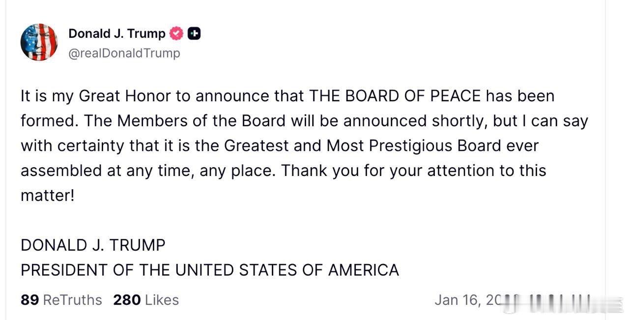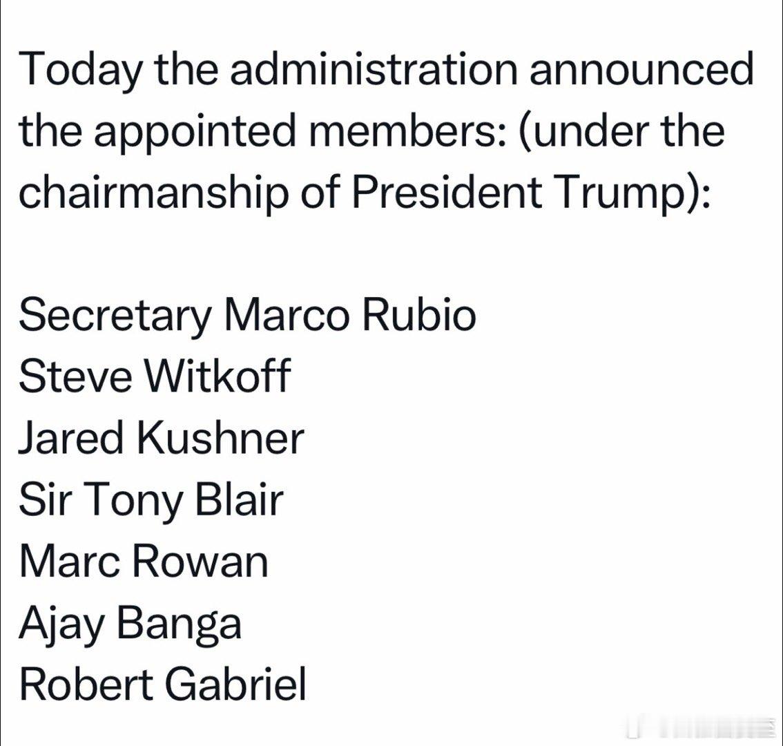 美国宣布加沙和平计划的下一步:组成“和平委员会”主席: 美国总统成员:国务卿、总统特使、总统女婿、前英国首相、华尔街大佬、世行行长、总统国安助理