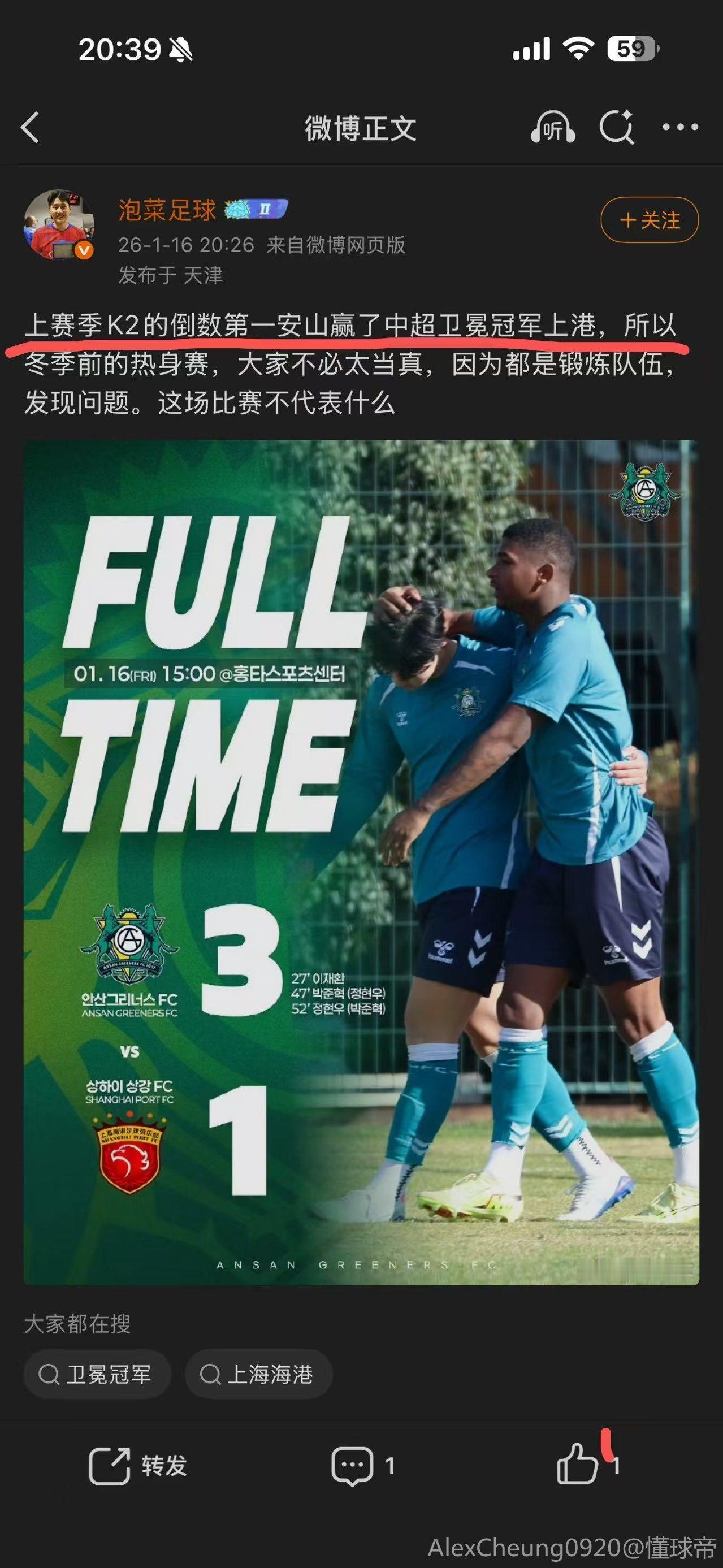 热身赛:巴库石油工人3-1成都蓉城,韩国安山绿人3-1上海海港 来看中超球队的冬训热身赛,正在阿联酋拉练的成都蓉城与巴库石油工人进行了一场友谊赛,最终成都蓉城1-3不敌对手。 另外知名足球博主“泡菜足球”:上赛季K2的倒数第一安山赢了中超卫冕冠军上港。不过上海海港官方的报道,与安山热身的,是上海海港B队,其中李圣龙发挥出色。 热身赛的目的是就是磨合队伍,发现问题,特别教练团队对一些替补球员的考察最为重要,结果并不重要。
