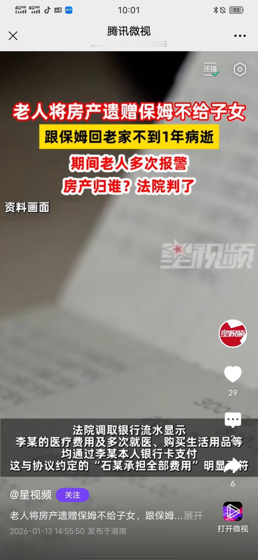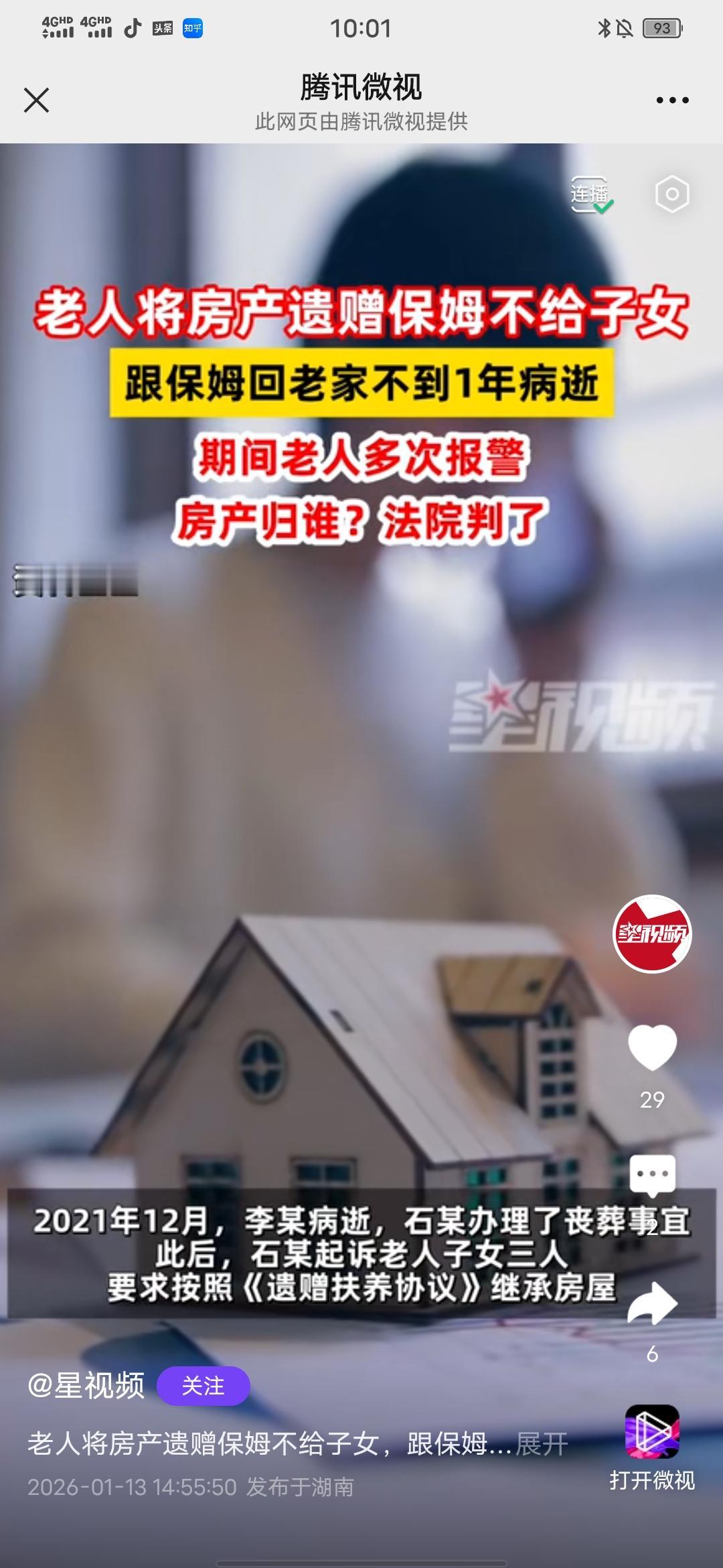 老人将房产遗赠保姆不给子女,跟保姆回老家不到1年病逝,期间老人多次报警,房产归谁? 刚刚在星视频看到一则这样的报道,北京市二中院审理的一起遗产纠纷案,我认为是可以警醒世人的,石某是李某的保姆,李某生前和保姆达成协议,意思就是石某继续扶养李某,直到终老,然后李某的房产就归保姆石某所有。并签了遗赠扶养协议。 然后李某就跟石某回老家生活了,结果不到1年就病逝了。然后石某就将李某的三个子女告上法庭,要求他们将李某的房产按协议给她,结果经审理调查了解,李某跟石某回老家生活期间,李某多次报警,而且生活,看病等一切支出也都是从李某银行卡支付的,这一系列都与他们的协议也不符。所以,最终判定子女按照法定继承房产。 很明显,这石某就是奔着人房产和财产去的,你可以按照这个交易想人家的房产,但是也要有契约精神吧,结果期间老人报警好几次,可想老人没有被善待的,至于怎么对待老人的,从老人报警几次来看,必不是什么小不敬。而且老人的一切开支也都是从老人自己的账户支出的,你不能啥好处都想占撒,哪有这好事。 老人家也是,明明有三个孩子,未必一个相对孝顺一点的都没有吗?不至于吧,就算他们想着的也是你的房产财产,不至于虐待你,让你连报警的心都有撒,子女们也是,三个血脉相连的兄弟也好,姐妹也好,给生养自己的父母养老是应尽的义务,为什么要让有心之人乘虚而入呢?自己的父母被人虐待你们也无动于衷吗? 唉,这时间的情啊,始终都是相互的,人心毕竟都是肉长得,再混蛋的人也能被捂热吧,也说不准,混蛋的人也有的是,只希望每人都心怀善念,种善因得善果吧!