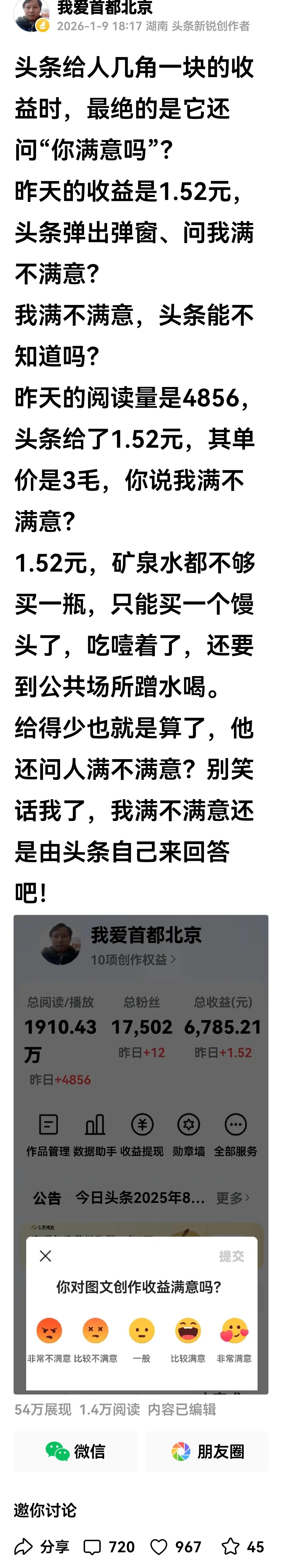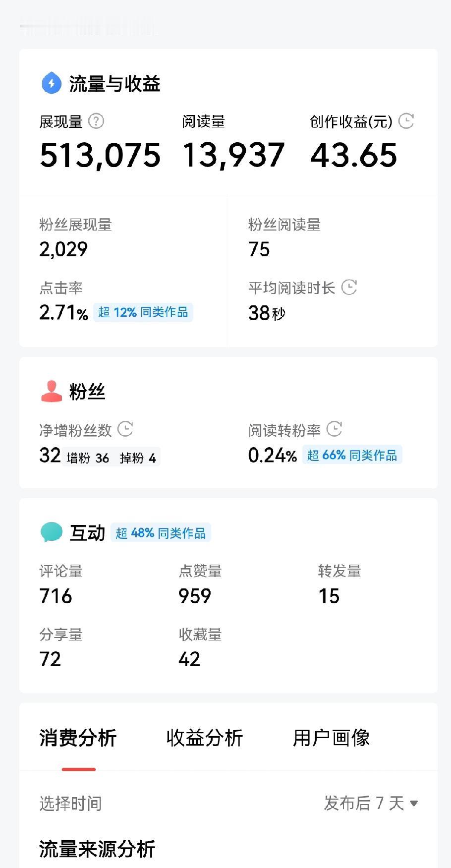 优质文章长啥样?我终于写出了一篇范文,因为这篇微文头条给了50多万的展现量。 而且最绝的是,一个多星期了、现在还在持续输入流量,似乎头条的推荐还未尽兴,推荐的劲头还在高涨,昨天的推荐数据更高,至少是6万以上。 头条肯推荐,自然是优质文章了,另外还有一个更重要的数据也可以判断其优质性,因为我的阅读单价平均就2元左右,而这篇微文13937的阅读量,头条显示的收益是43.65元,单价达到了3.2元。 不过这篇微文现在展示的数据有一个比较大的缺憾!那就是点击率不高,记得当天发表时,点击率还是可观的,好像差不多20%,但是到现在已经降到了2.7%,不过欣喜的是头条还在大量的推,这也恰好再次证明这篇微文被头条定义为特别优质的文章,要知道,我比较好的微文流量一般就在三、四万而已,另一篇较突出的也只有接近28万的展现量。 既然是优质作品,建议大家去看看(后面有配图),看看优质作品长啥样?为大家今后的创作提供一下经验,希望对大家有所帮助。 大家去观看这篇微文的时候,建议大家从这几个方面入手: 其一,看是否是原创? 其二,其内容与账号的创作领域垂不垂直? 其三,有没有信息增量? 其四,文章的内容真不真实? 其五,看结构,结构设计得合不合理?逻辑清不清晰?文字的表述准不准确? 之所以给大家五个方面的提示,因为头条认定的优质文章必须满足以上五个条件。 好了,就到这里了,大家去看看吧!看看是不是一次愉快的体验!(看配图)