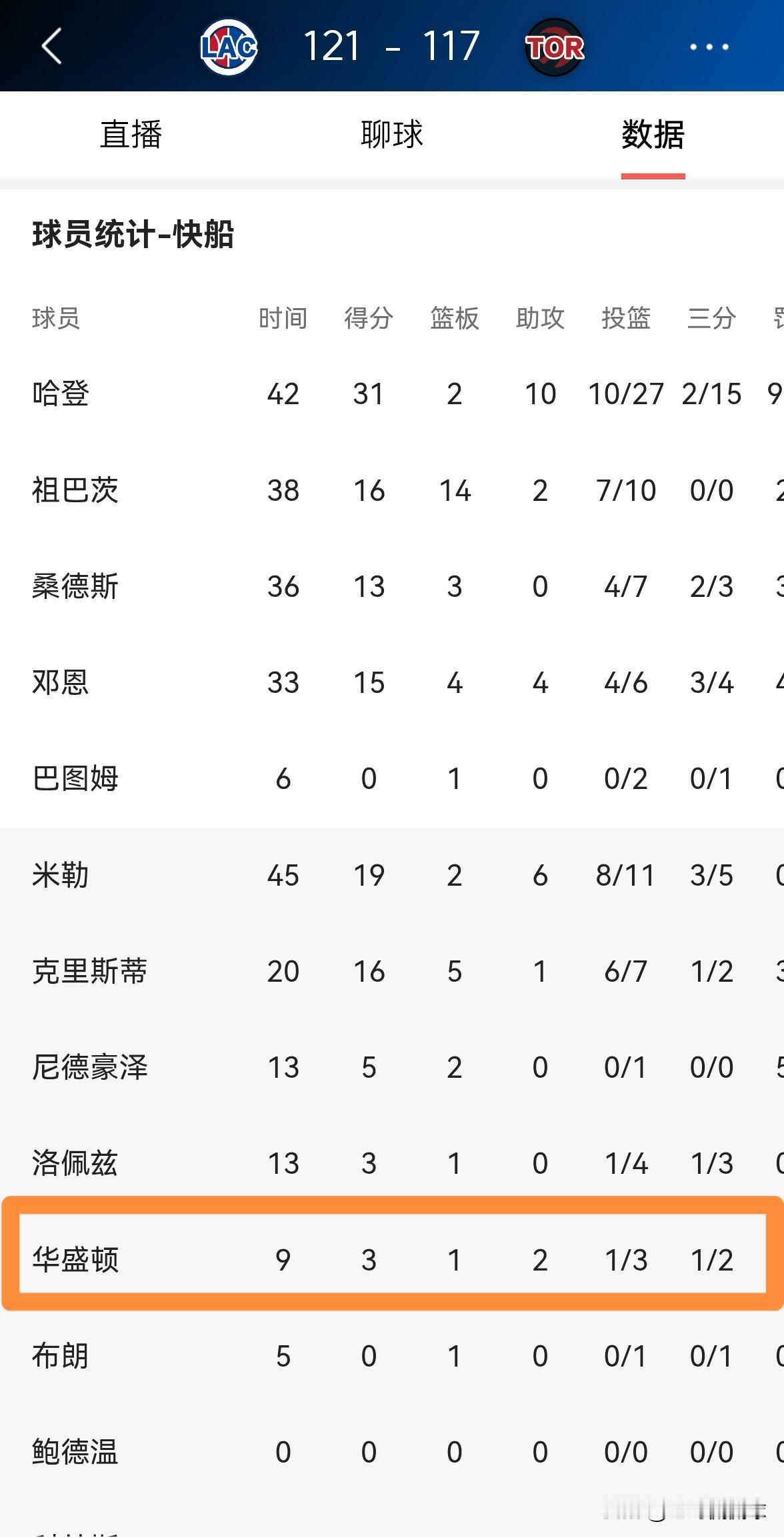 快船小将华盛顿真是让人眼前一亮!在今天快船客场以121:117击败猛龙的比赛中,小将华盛顿敢打敢拼给人留下了非常深刻的印象。 全场比赛下来,华盛顿替补出战9分钟,投篮3中1,其中三分球2中1得到3分1篮板2助攻1盖帽,没有出现失误和犯规,他的场上正负值为+2。 老实说,如果快船主帅泰伦-卢能够在接下来的比赛中给予华盛顿更多的上场时间,我相信华盛顿会逐渐兑现自己的篮球天赋。