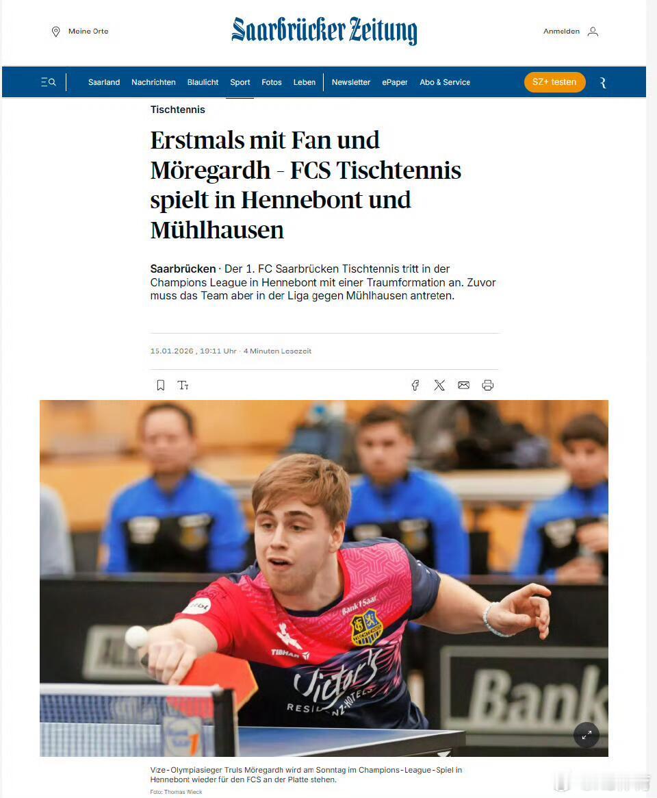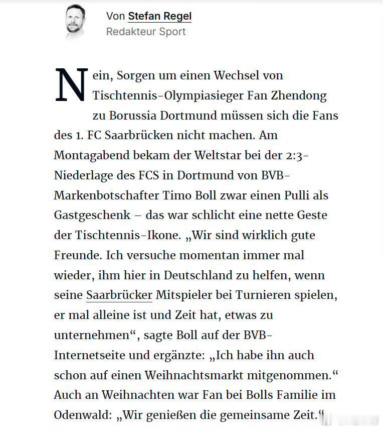 樊振东球队客场战胜穆尔豪森来自萨尔日报:萨尔布吕肯的球迷们不用担心,樊振东并不会转会至多特蒙德。在周一晚萨尔布吕肯客场 2:3 不敌多特蒙德的比赛后,这位世界级球星的确是从多特蒙德品牌大使蒂姆・波尔手上接过了一件球衣—— 但只是作为赠礼,只是来自乒坛传奇波尔的一番友好举动罢了。萨尔队员周四乘车前往图林根州(穆尔豪森主场),与穆尔豪森这场联赛一结束,球队就得连夜赶回萨尔布吕肯,周六清晨再奔赴法国,客场挑战亨尼邦俱乐部,开启欧冠四分之一决赛首回合较量。对手的阵容除法国运动员西蒙・高茨之外,还有三名中国球员陈垣宇(世排23)、周启豪(世排36)、温瑞博(世排53)。目前不清楚亨尼邦会派出哪些球员。奥运亚军莫雷加德也将加入萨尔布吕肯的欧冠阵容。他需要出战两场欧冠赛事,才能获得在萨尔兰体育馆举办的欧冠决赛阶段的参赛资格。尽管对手实力强劲,但萨尔布吕肯拥有奥运冠亚军樊振东与莫雷加德这对组合,两人首次共同身穿萨尔布吕肯球衣出战。1月19号期待樊振东,期待萨尔布吕肯!