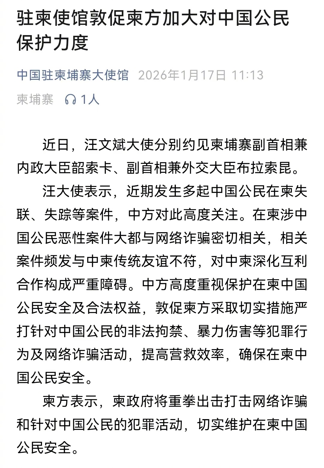 【#多名中国公民在柬失联失踪#,#中国驻柬埔寨大使约见柬副首相#】据中国驻柬埔寨大使馆,近日,汪文斌大使分别约见柬埔寨副首相兼内政大臣韶索卡、副首相兼外交大臣布拉索昆。汪大使表示,近期发生多起中国公民在柬失联、失踪等案件,中方对此高度关注。在柬涉中国公民恶性案件大都与网络诈骗密切相关,相关案件频发与中柬传统友谊不符,对中柬深化互利合作构成严重障碍。中方高度重视保护在柬中国公民安全及合法权益,敦促柬方采取切实措施严打针对中国公民的非法拘禁、暴力伤害等犯罪行为及网络诈骗活动,提高营救效率,确保在柬中国公民安全。柬方表示,柬政府将重拳出击打击网络诈骗和针对中国公民的犯罪活动,切实维护在柬中国公民安全。