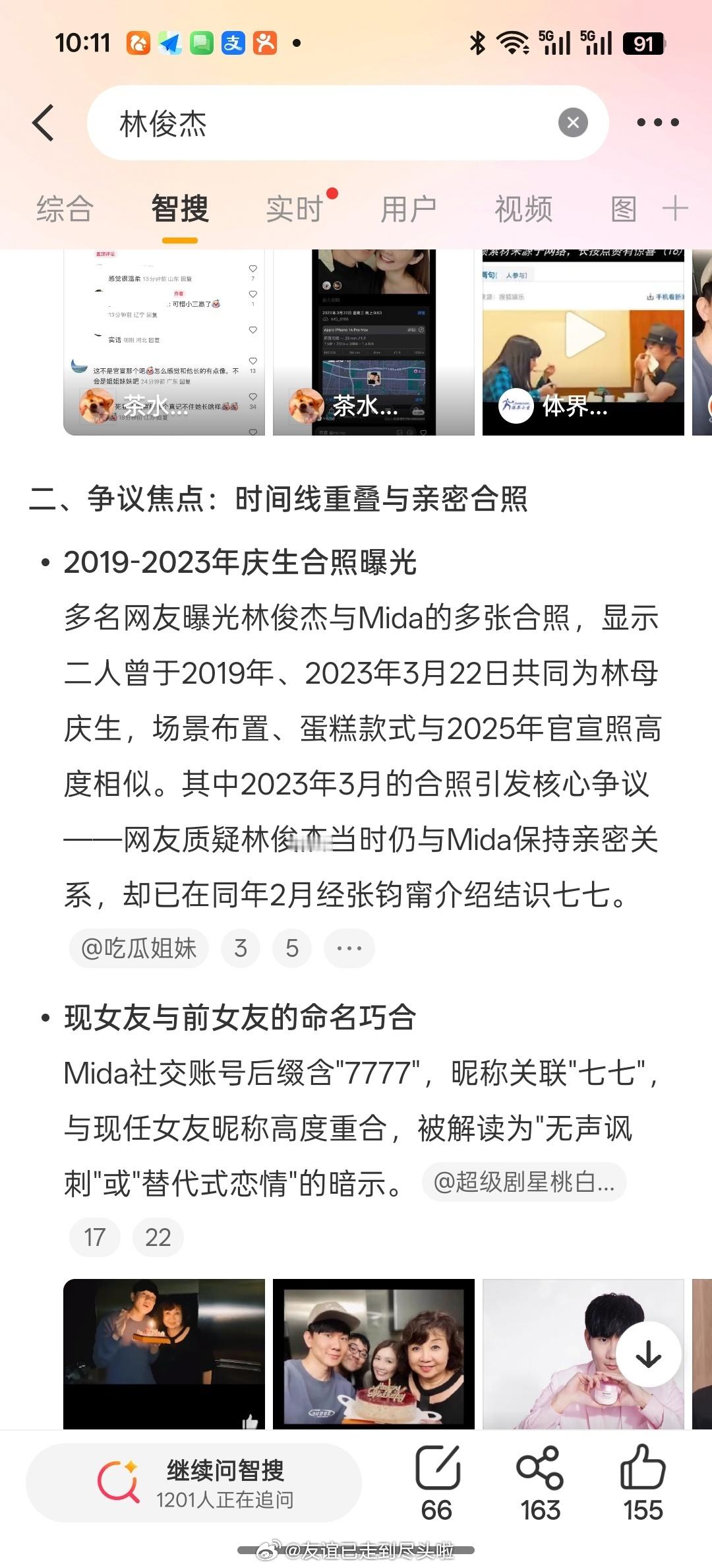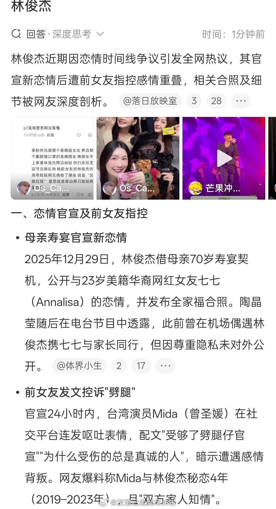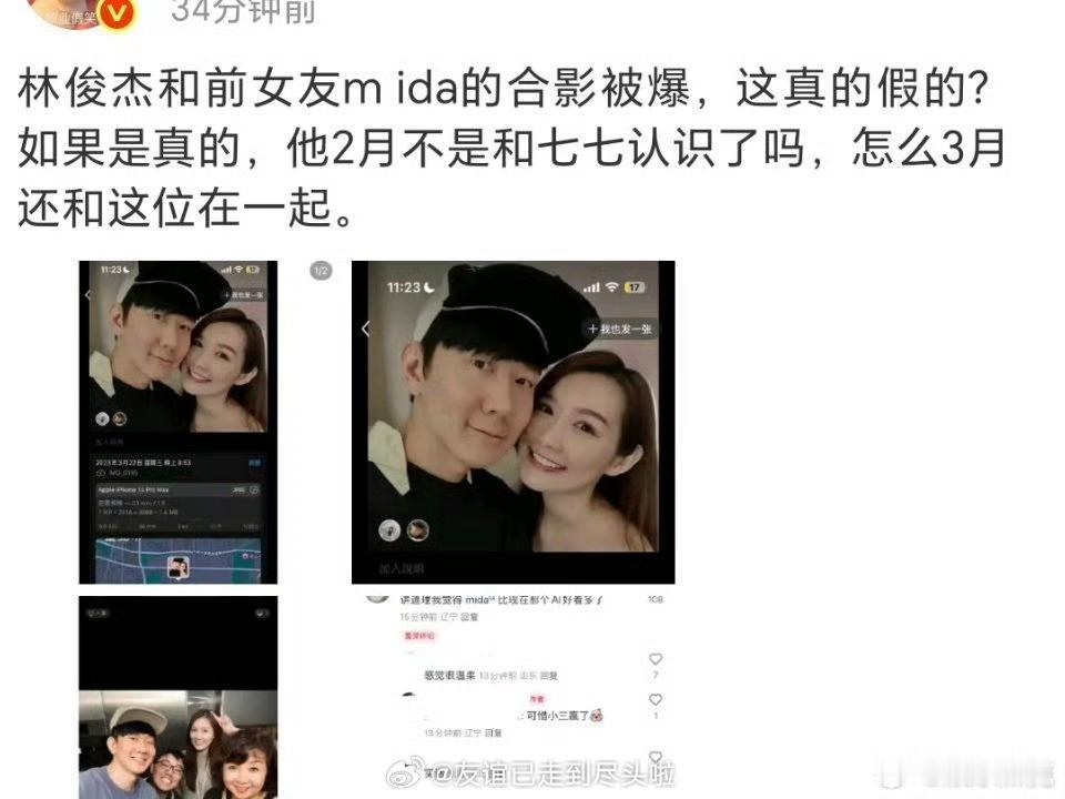 曝林俊杰与前女友合照林俊杰公开恋情这事还没完呢,刚公开恋情就有台湾女艺人mida在社交软件内涵他劈腿,现在爆出两个人2019-2023年的合影,同样也是带女方参加林俊杰妈妈生日,同样昵称都有77,怎么就这么巧呢 今天也要开心