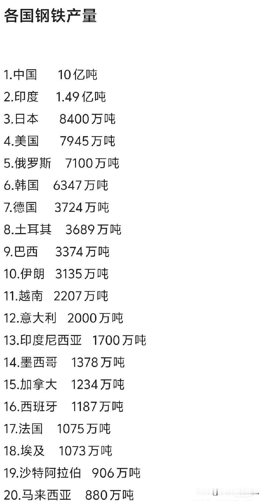 世界钢铁产量前二十名国家排名情况,图片里属于世界钢铁产量前二十国家排名,中国钢铁产量大约以10亿吨左右排名世界各国榜一,可见中国属于世界钢铁产量排名最高的国家。