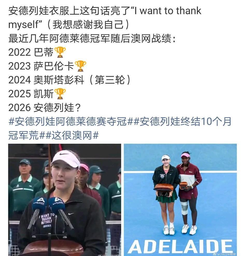 最近四年的澳网女单冠军有3个是由阿德莱德冠军获得,所以小米辣这个冠军太重要了。