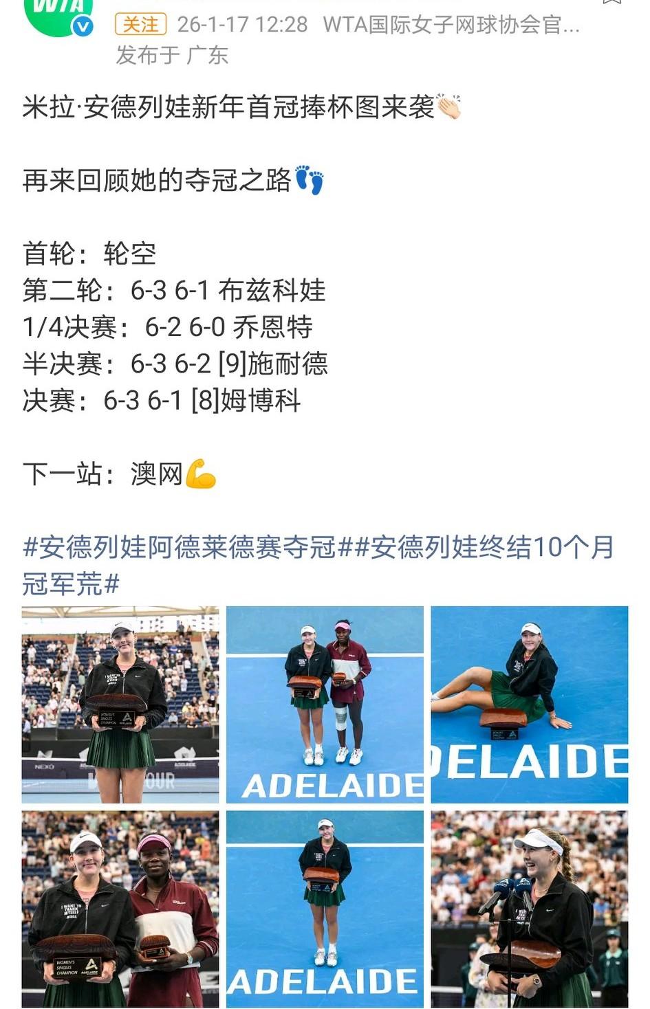 最近四年的澳网女单冠军有3个是由阿德莱德冠军获得,所以小米辣这个冠军太重要了。 阿德莱德女单决赛,安德烈娃6-3/6-1横扫姆博科夺得阿德莱德冠军。终结10个月冠军荒,10月好像也没有很荒。
