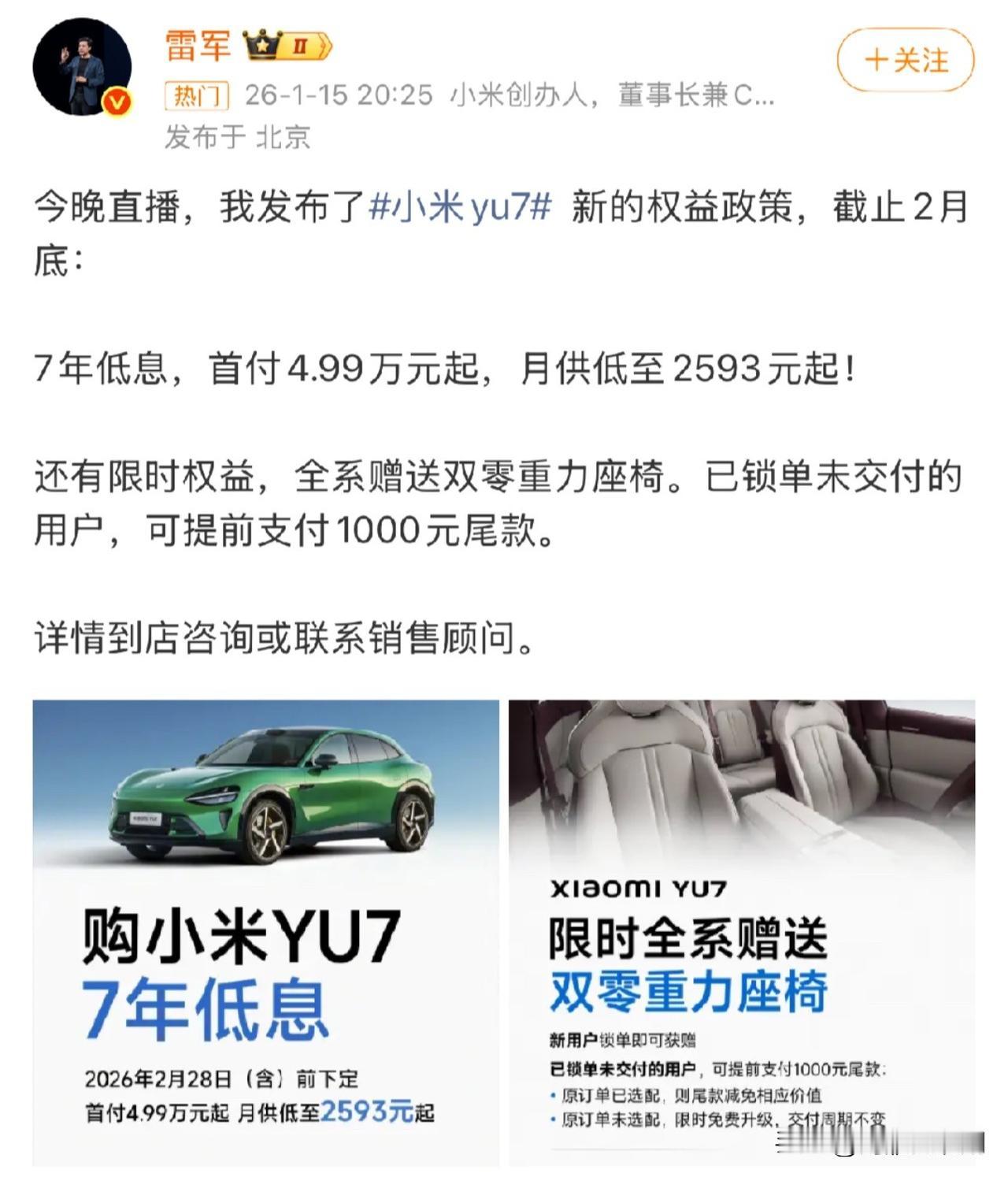 小米汽车7年低息,首发用户指责背刺 小米跟上了特斯拉的脚步,也推出了7年低息,现在买车还送零重力座椅。不过不少首发用户直接就在评论区指责背刺。 这波我感觉小米倒是没做错啥,车和手机一样,车这玩意大家更新换代都很慢,本身就是越做越便宜,越做折扣力度,也就是传说中的等等党永不亏,就是首发用户肯定要伤心了。 我个人就是感觉这种7年低息,估计可能会有不少人选择强行上车,尤其车这种东西,不管油车还是电车,7年以后残值能有原价20%~30%就不错了,到时候可能要出现不少纠纷,