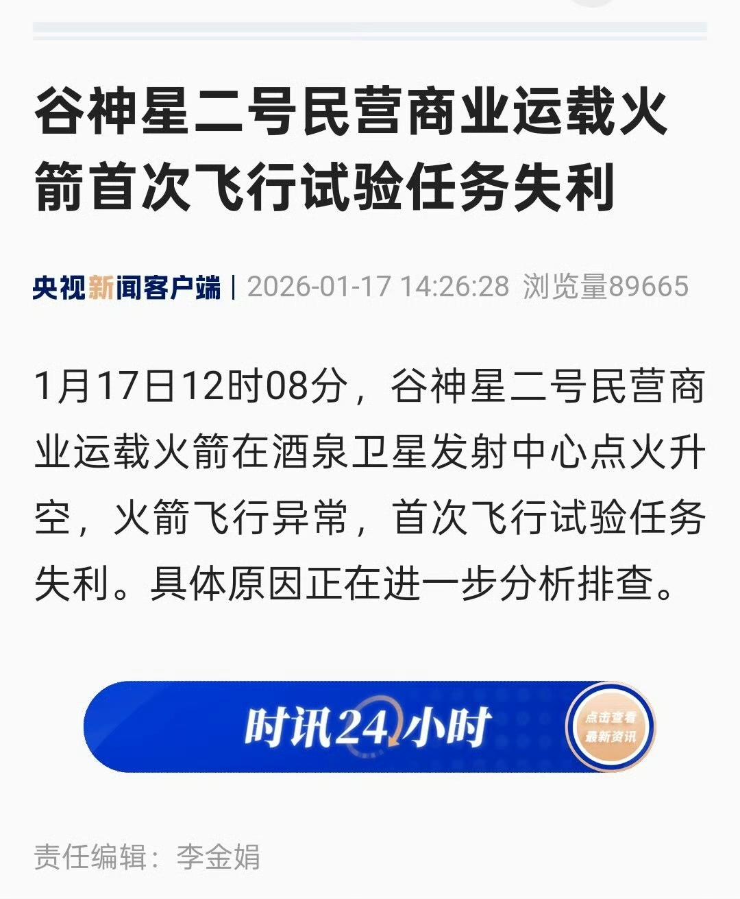 今天两次发射均任务失利! 谷神星二号首次飞行试验任务失利、实践三十二号卫星发射失利,看来航天想取得快速成功,还是有非常大的难度的。 最近的两次运载火箭尝试回收也失败了,再接再厉,马斯克的spacex也是尝试过多次之后才逐步取得成功的。 各位是怎么看的?欢迎评论区留言。