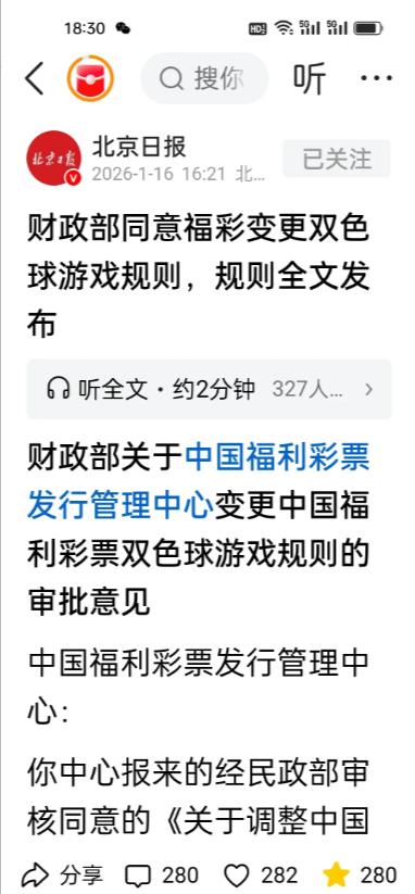 刚刚,2026体彩福彩新规落地,3个红球就中奖,增加彩民获得感!很多彩民问,为什么现在要改规则?这事得从彩票行业的“老毛病”说起——旧规则像个跷跷板,一头是动不动被掏空的奖池,一头是90%彩民“陪跑”的尴尬,再不调,真要走不动了。 以前的双色球,奖池超过10亿能上新闻,超过20亿能炒热全网。但热闹背后藏着隐患:2023年双色球某期井喷46注头奖,奖池直接从8亿跌到“低保线”3000万,相当于把未来半年的头奖奖金提前分完了。 大乐透更夸张,2025年连续6期头奖低于150万,最低一期72万,网友戏称“中头奖不如中双色球二等奖”。 问题出在奖金分配。旧规则里,双色球中5个红球(5+0)只能拿200元,大乐透中4个前区(4+0)才10元,大量彩民长期“只投入、不中奖”。 而头奖呢?一旦奖池高,彩民扎堆买,容易触发“井喷”,奖金被稀释成“蚊子腿”。 2023年统计,双色球全年销量3000亿,中小奖占比不到40%,70%的彩民一年到头没中过100元以上的奖——这种“要么一夜暴富,要么颗粒无收”的模式,早把多数人熬走了。 老彩民都知道,以前买双色球,中3个红球(3+0)相当于“谢谢参与”。2025年调研显示,62%的彩民觉得“中奖太难,玩着没劲”。 有个真实例子:郑州某彩票店老板说,2024年下半年,每天固定来买10注的20多个老客户,陆续只剩3个,“他们说反正都是赔,不如不买”。 这种“金字塔”结构早该改了。新规把双色球3+0变成“福运奖”,奖池≥15亿时直接拿5元,中奖概率从6.7%涨到8.26%。 大乐透更彻底,把9个奖级砍到7个,中3个前区(3+0)保底5元,奖池高时能拿7元。 别小看这几块钱,深圳试点时,某彩票店新规后两周销量涨了25%,老板说:“以前年轻人买完就走,现在中个5块还愿意再聊两句。” 很多人不知道,彩票销售额的35%要进公益金,用于养老、助残、体育这些民生项目。但旧规则下,奖池波动大,公益金跟着不稳定。 2024年审计发现,某省因双色球奖池连续掏空,全年公益金比预算少了1.2亿,直接影响200多个养老院的设备更新。 新规把公益金比例从35%提到36%,还加了“调节基金”。比如双色球奖池超过15亿才启动福运奖,低于3亿就停,避免奖金“暴饮暴食”。 大乐透更绝,头奖单期封顶1亿,多余的钱回流奖池和公益金。财政部测算,新规实施后,每年公益金能多收10亿,相当于多建500所乡村小学——这才是彩票“扶老助残”的初心。 有人说“中奖变容易,彩票要亏钱”,其实恰恰相反。2018年双色球加过胆拖玩法,销量涨了18%,但中小奖没跟上,3年后又回落。 这次不一样,广东试点数据显示,新规后中小奖兑付增加30%,但总返奖率控制在51%(以前50%),多出来的1%刚好补上公益金。 更关键的是“可持续”。以前奖池高时,彩民猛买,低时没人买,像坐过山车。 新规用“奖池挂钩制”——双色球福运奖看15亿水位,大乐透中小奖分8亿上下两档,让奖金分配更平滑。 体彩中心内部测算,这种动态调节能让奖池波动幅度降低60%,避免2025年大乐透那种“6期掏空4次”的极端情况。 新规不是让你发财,而是让你玩得有意思。中3个红球的5块钱,相当于买瓶水的快乐;中5个红球的300元,够吃顿火锅。 但要记住:双色球一等奖还是1772万分之一,大乐透2142万分之一,买100年不一定中。 财政部强调“理性购彩”,北京试点已要求彩票店张贴“单次投注不超200元”的提示——这不是限制,是怕你上头。 说到底,这次改规则是门“平衡术”:让常买的人常有小惊喜,让公益金稳定输血,让奖池不再坐过山车。