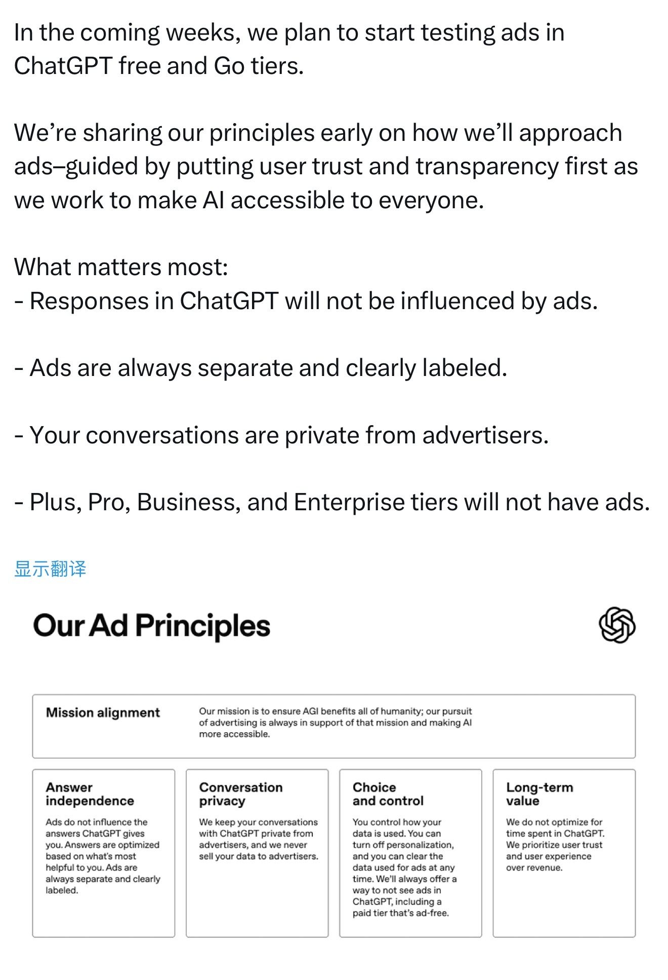 ChatGPT也要插入广告了:在接下来的几周里,我们计划开始在 ChatGPT 免费版和 Go 版中测试广告。Plus、Pro、Business 和 Enterprise 版本将不包含广告。
