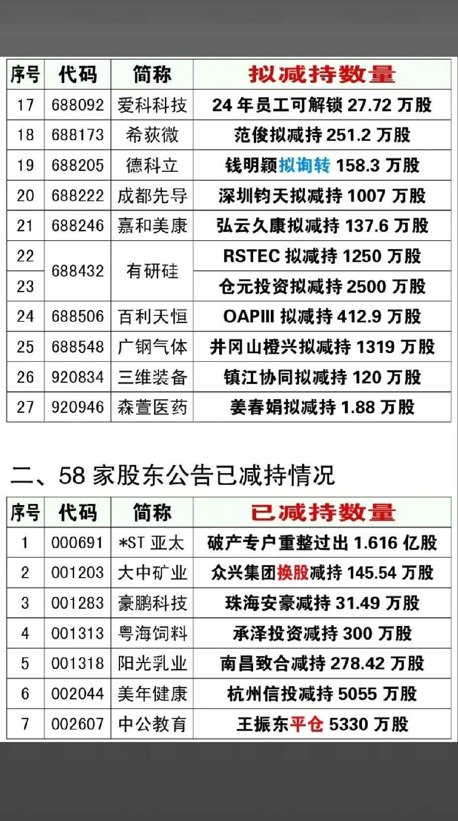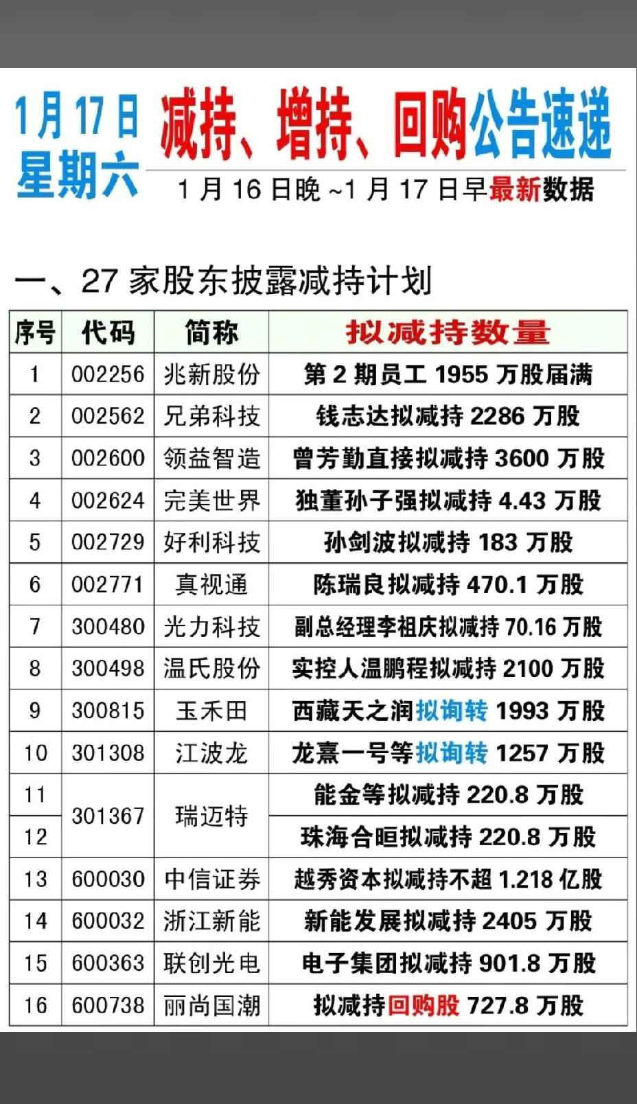 1月17日,下周A股这些股票值得重点关注!!! 27家股东披露减持计划,重点关注:新能发展拟减持浙江新能2405万股,后市值得重点关注;58家股东公告已减持情况;4家公司披露增持计划;12家公司公告已增持情况;1家公司披露回购计划!!!